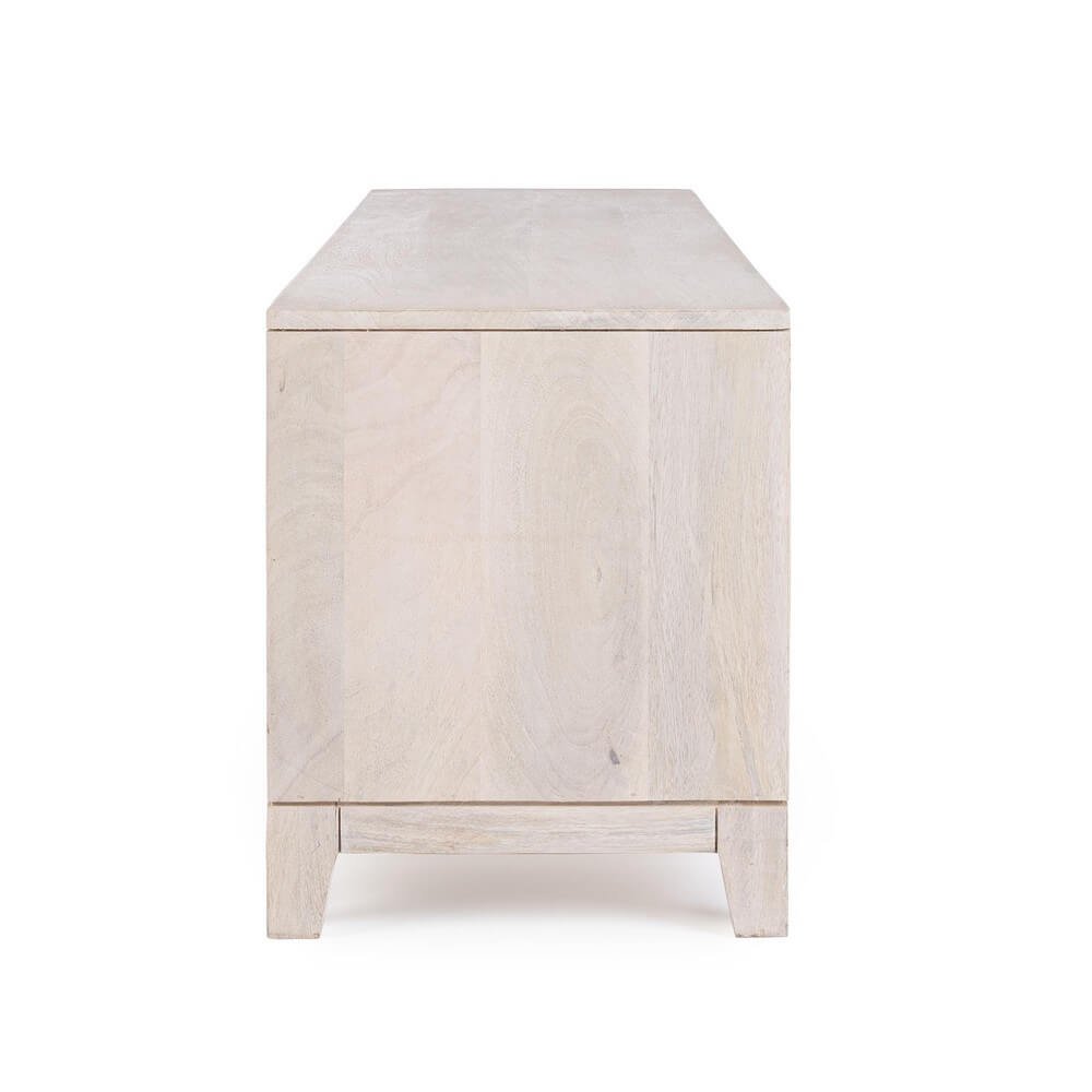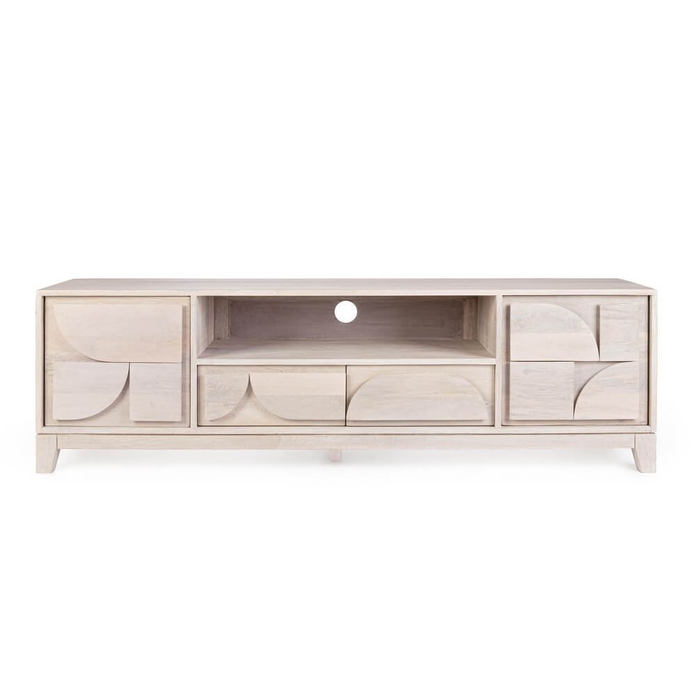 Il Mobile Porta TV Legno Marrone Moderno da Interno – BRIELLE è una raffinata soluzione d’arredo che coniuga funzionalità e stile in un perfetto equilibrio estetico. Realizzato con una solida struttura in legno di mango e dettagli in MDF per lo schienale e il fondo dei cassetti, questo mobile presenta una verniciatura nitrocellulosica con elegante decapatura bianca, che dona un aspetto vissuto e luminoso, esaltando le venature naturali del legno. Le ante e i cassetti sono arricchiti da rilievi geometrici curvilinei che conferiscono carattere e unicità al design, mentre l’ampio vano centrale con foro passacavi risponde a esigenze pratiche di organizzazione e gestione dei dispositivi elettronici. Dalla linea slanciata e contemporanea, il BRIELLE si inserisce con disinvoltura in ambienti moderni o dallo stile scandinavo e naturale, aggiungendo calore e personalità alla zona living. Ideale per chi cerca un mobile TV che vada oltre la semplice funzione contenitiva, questo arredo si distingue per qualità dei materiali, design distintivo e versatilità. L’esperienza d’uso si arricchisce nel quotidiano grazie alla sua struttura solida, ai dettagli estetici evocativi e alla capacità di trasformare lo spazio in un ambiente accogliente e ricercato.