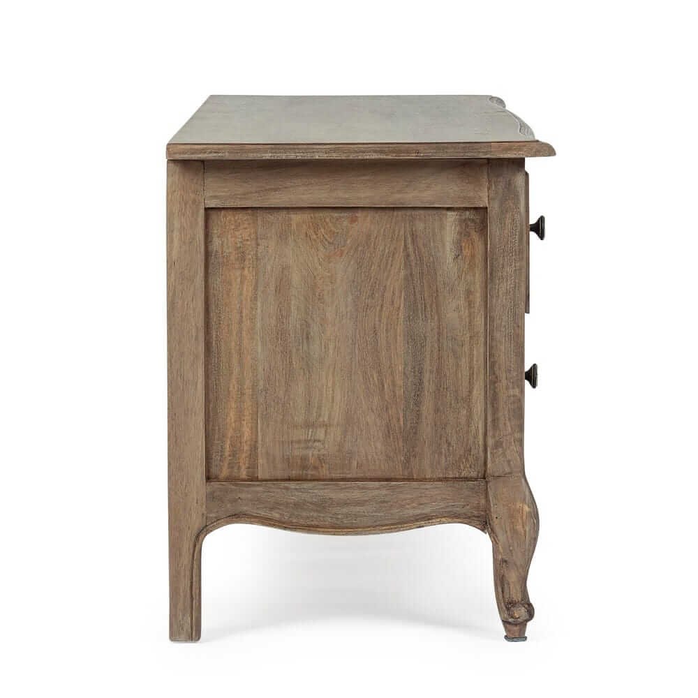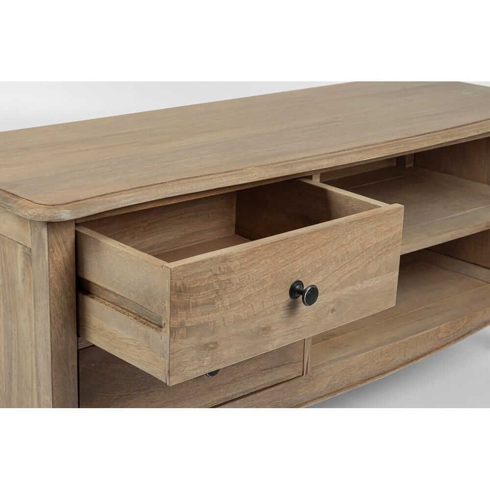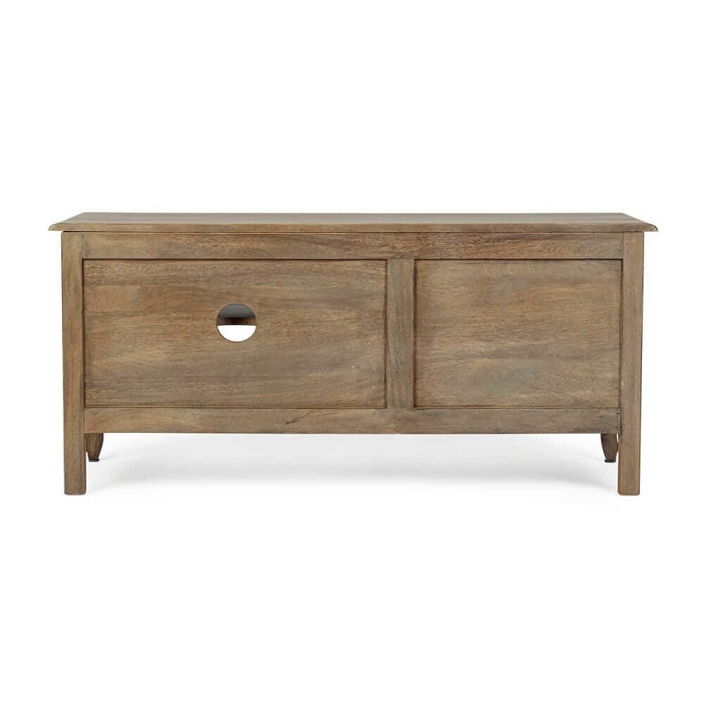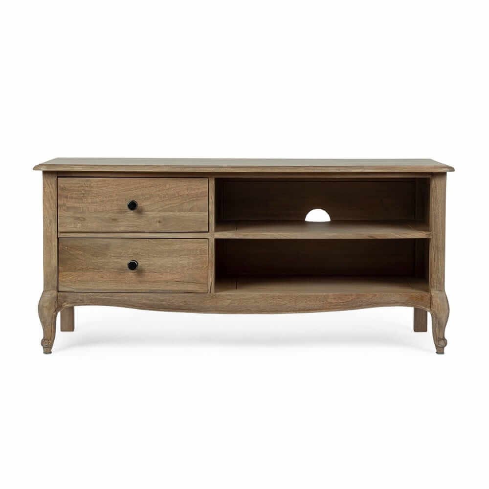 Il Mobile Porta TV Legno Marrone Rustico da Interno – SERAPHINA è una soluzione d’arredo affascinante e funzionale, ideale per completare ambienti dal gusto classico o country chic. La solida struttura in legno di mango con finitura a base d’acqua esalta la venatura naturale del materiale, conferendo calore e autenticità all’ambiente domestico. Il colore marrone rustico si abbina con eleganza a interni in stile naturale o vintage, mentre le maniglie in ghisa nere aggiungono un piacevole contrasto d’ispirazione industriale. I due spaziosi cassetti e le mensole aperte permettono di organizzare con ordine dispositivi elettronici, telecomandi e accessori, con uno schienale dotato di foro passacavi che garantisce la massima praticità. Le gambe lavorate e i dettagli lievemente bombati rendono questo mobile TV una presenza di carattere ma discreta, capace di valorizzare il soggiorno senza sovrastarlo. Il Mobile Porta TV – SERAPHINA unisce estetica raffinata e utilità quotidiana, offrendo una postazione perfetta per momenti di relax davanti allo schermo, incorniciati da uno stile che parla di cura artigianale e bellezza senza tempo.