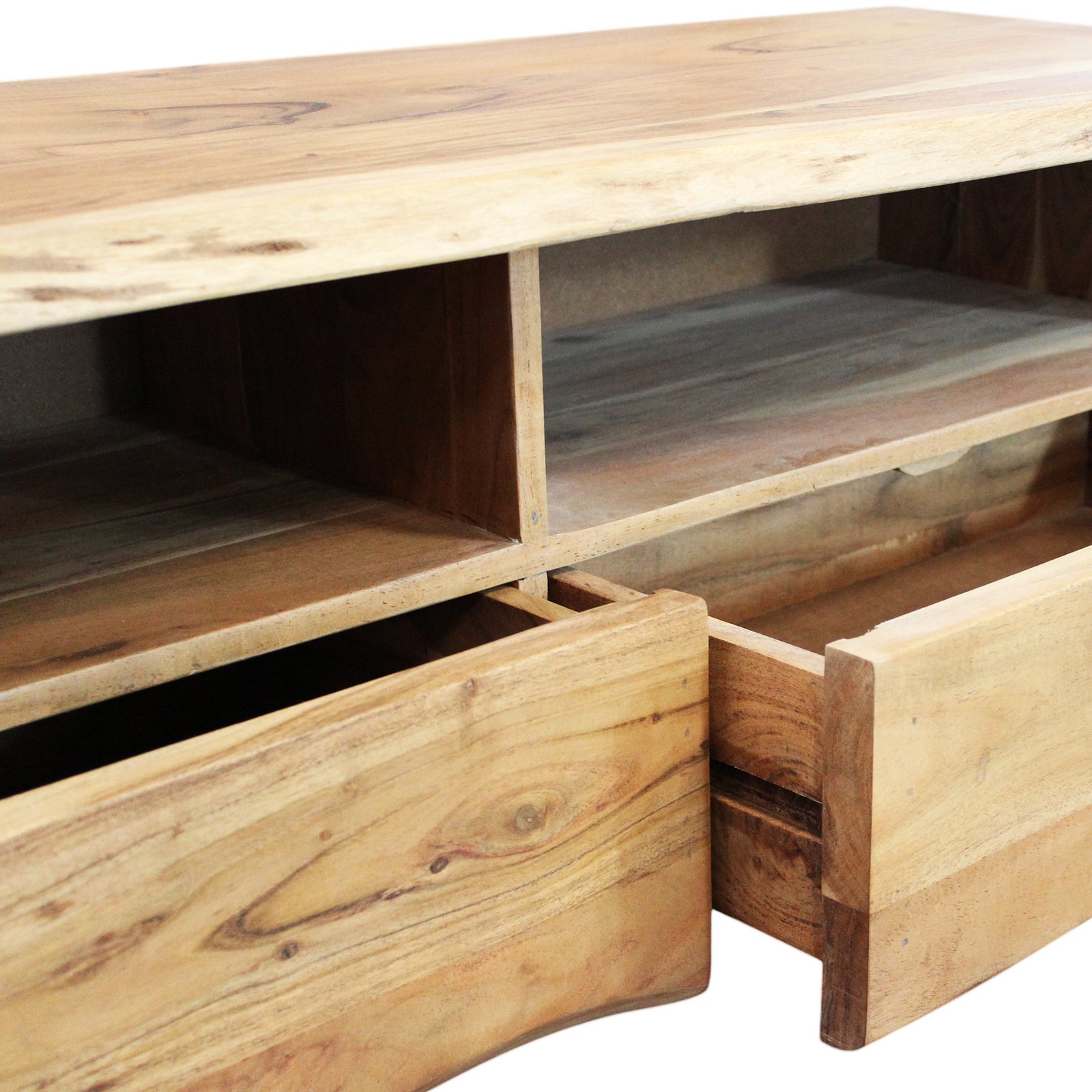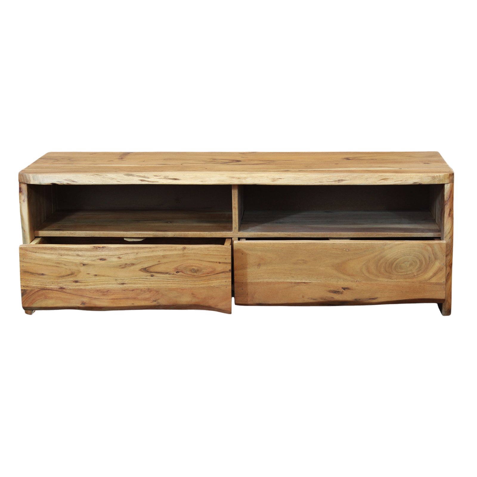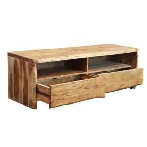 Il Mobile TV in legno di acacia NENNY è un elemento d’arredo che unisce funzionalità ed eleganza naturale, perfetto per chi desidera valorizzare il soggiorno con un tocco autentico e contemporaneo. Realizzato interamente in legno massello, si distingue per le sue venature irregolari e la finitura artigianale che mette in risalto la bellezza del materiale naturale. Il suo design pulito ma dal forte impatto visivo è arricchito da dettagli unici come il bordo vivo che mantiene la forma naturale del tronco, conferendo un aspetto organico e raffinato al pezzo. Con dimensioni compatte di 120x40x40 cm, il mobile TV NENNY offre una soluzione pratica e armoniosa per organizzare dispositivi multimediali e accessori, grazie alla presenza di due vani a giorno con fori passacavi e due ampi cassetti inferiori. Il colore caldo del legno marrone si adatta perfettamente a stili d’arredo rustici, industriali o moderni dal gusto minimal, creando un’atmosfera accogliente e sofisticata. Ideale per chi cerca un mobile porta TV che coniughi estetica e praticità, il modello NENNY trova la sua massima espressione in ambienti living curati e dal carattere autentico.