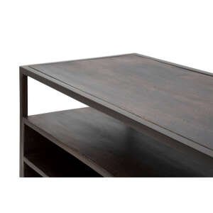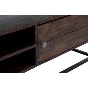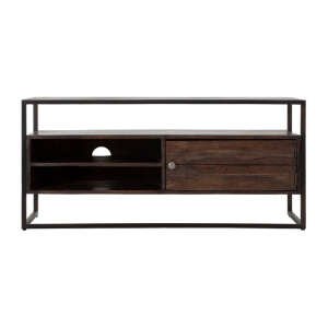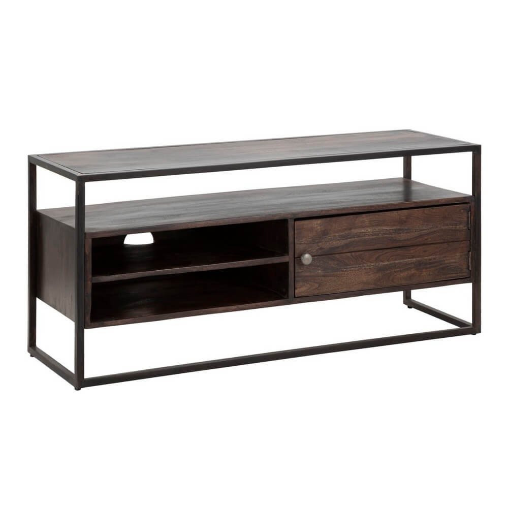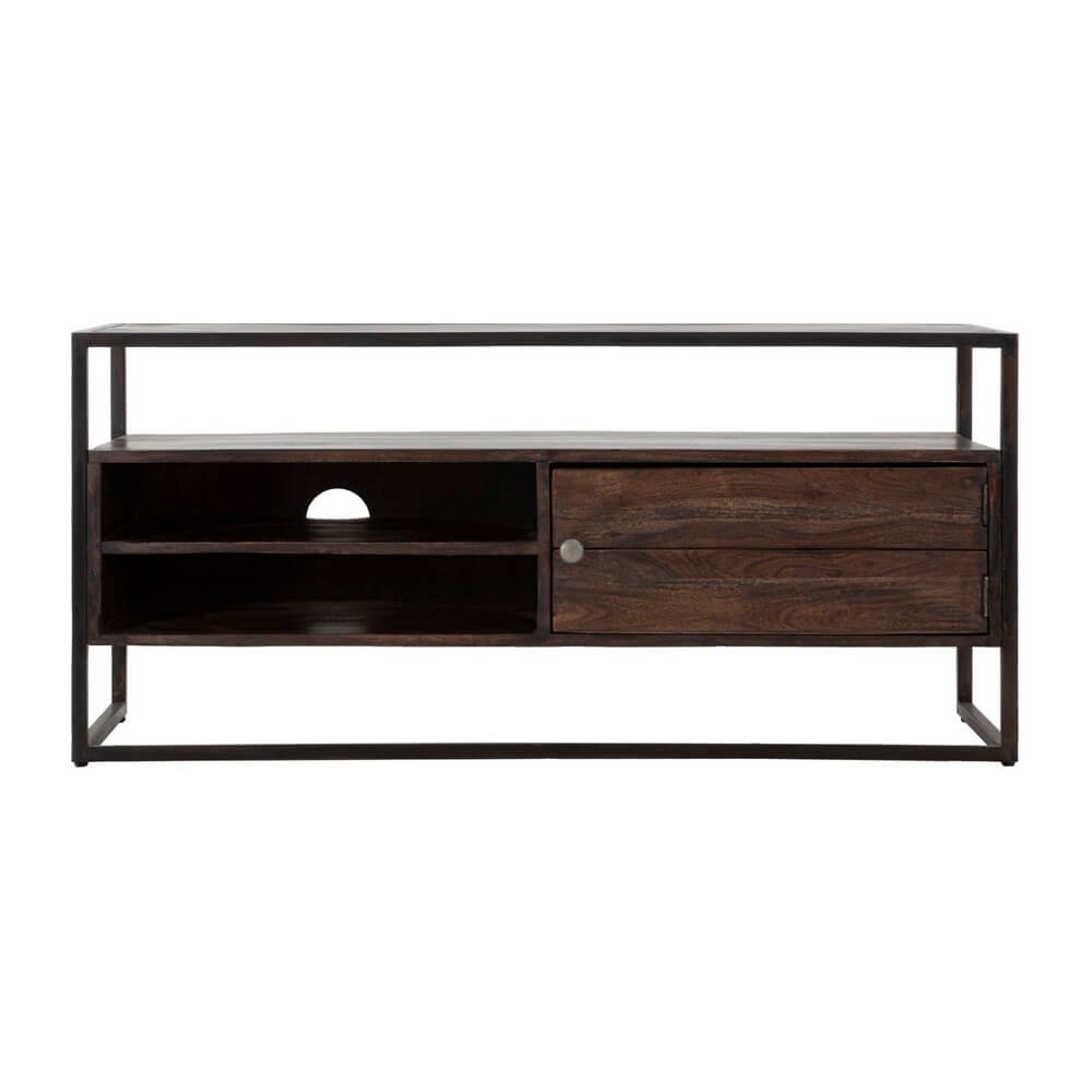 Mobile porta TV in legno massello di acacia con 3 ripiani e anta incorniciato in una struttura in metallo nero dalle linee pulite e squadrate che dona un tocco di modernitร ad un pezzo estrememante elegante e classico.