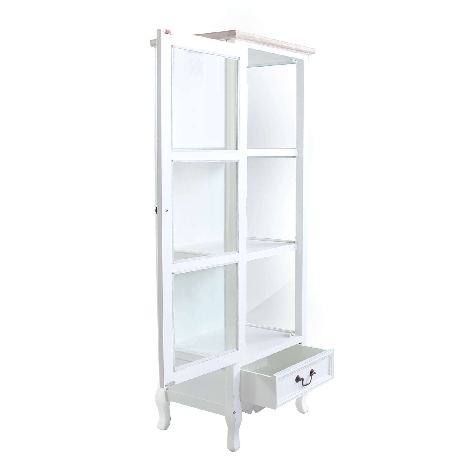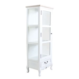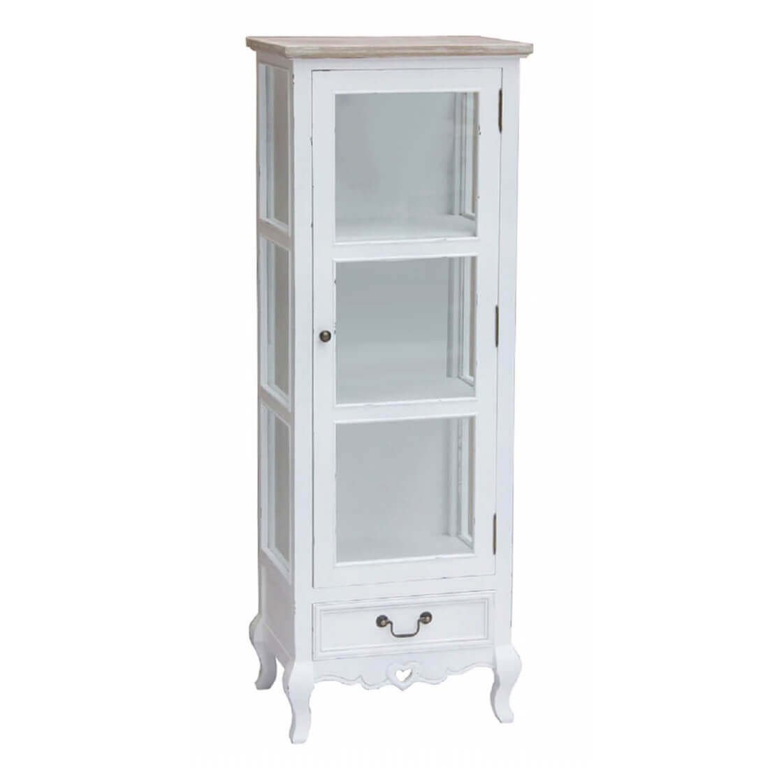 Elegante e ricercata, la Credenza con vetrina shabby chic in Legno Vetro cm 50x37x141 – ROB è la scelta ideale per chi desidera arredare la propria casa con uno stile romantico e raffinato. Realizzata in legno di paulonia e MDF impiallacciato, combina sapientemente la solidità dei materiali con la leggerezza delle linee shabby chic. La struttura è verniciata in un delicato bianco opaco che dialoga armoniosamente con il top color nocciola, donando un tocco caldo e naturale. I tre ripiani interni racchiusi da una vetrina in vetro trasparente permettono di esporre oggetti decorativi, porcellane o libri, mantenendo tutto ordinato e protetto, mentre il cassetto inferiore aggiunge spazio contenitivo con eleganza. Le gambe sinuose e i dettagli scolpiti sul cassetto conferiscono un fascino vintage senza tempo. Questa vetrina è perfetta per completare ambienti living, cucine rustiche, ingressi o camere da letto caratterizzati da un arredo in stile country chic, provenzale o classico. La credenza ROB non è solo un mobile funzionale, ma un vero e proprio elemento d’arredo capace di valorizzare qualsiasi spazio con charme e personalità.