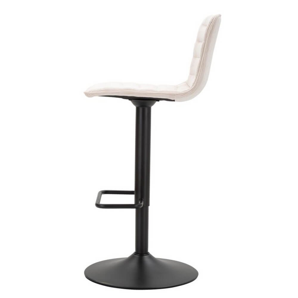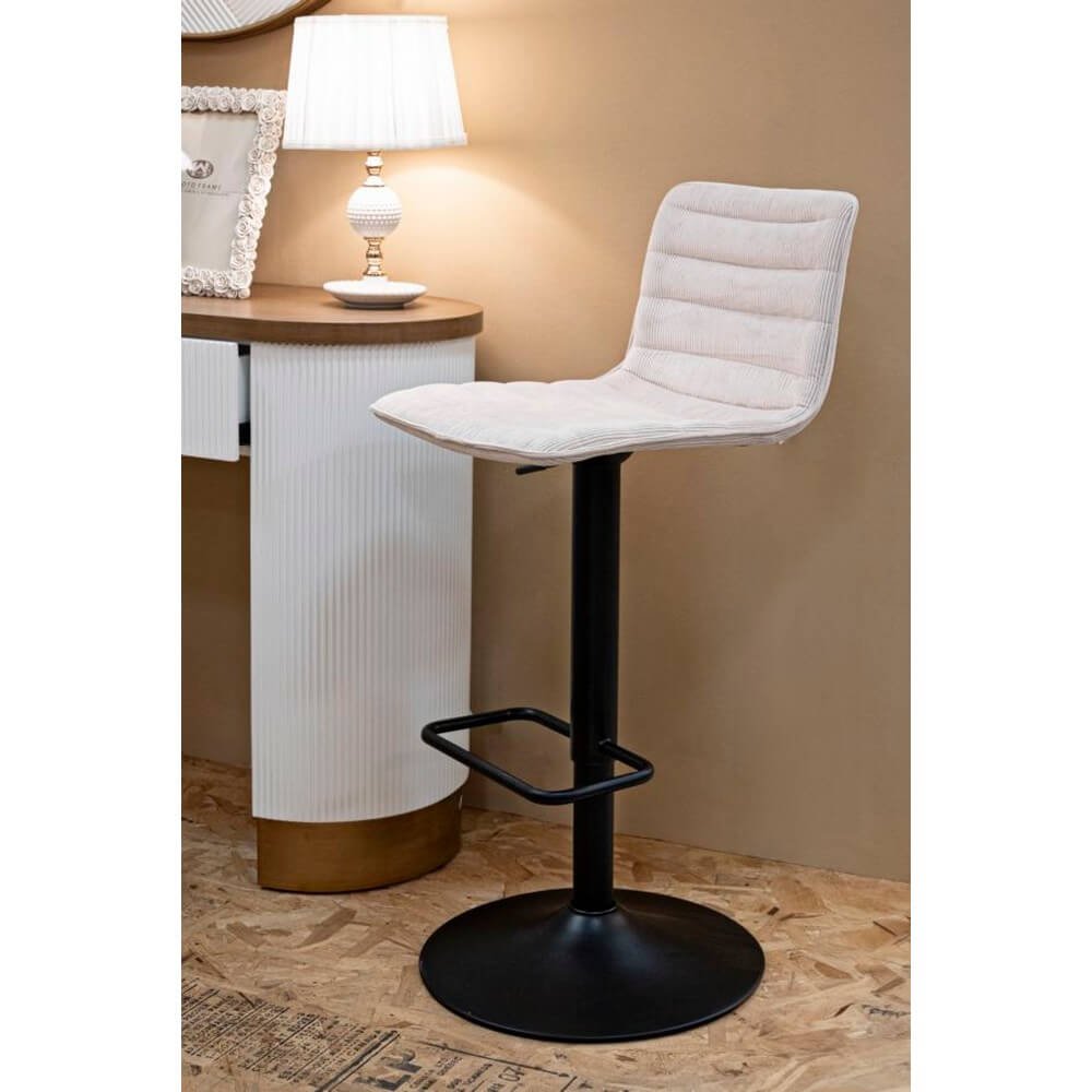 Sgabello bar rotondo girevole in metallo e tessuto imbottito con schienale imbottito. Completo di regolatore d’altezza. Il design semplice richiama gli anni ’70.