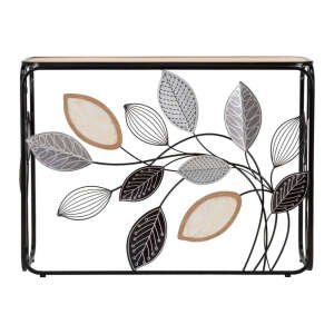 Console rettangolare in metallo nero con foglie decorative e piano in legno marrone.