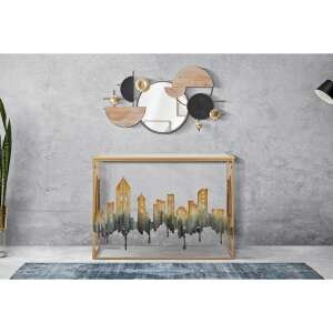 Console rettangolare in metallo dorato decorata con un profilo di città dai colori soft. Completa di piano in vetro a specchio.