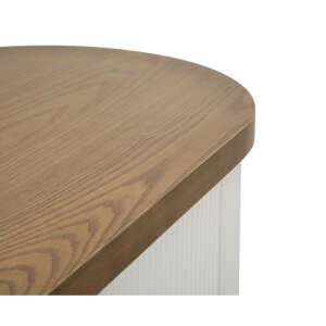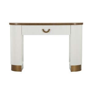 Console in legno bianco con piano e inserti in legno marrone dal design arrotondato.Finemente decorata con linee in rilievo. Completa di cassetto.