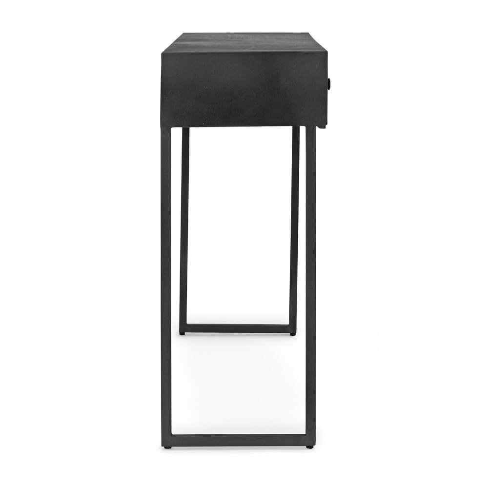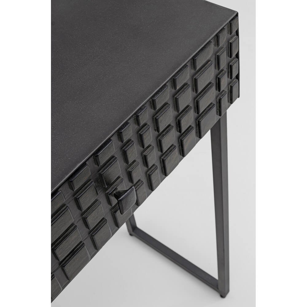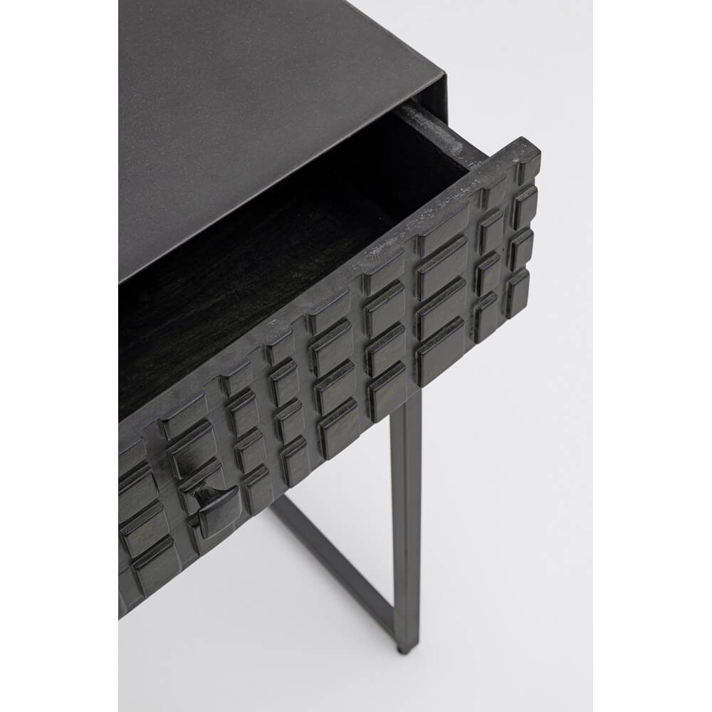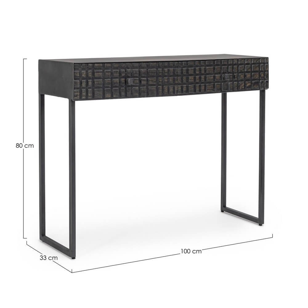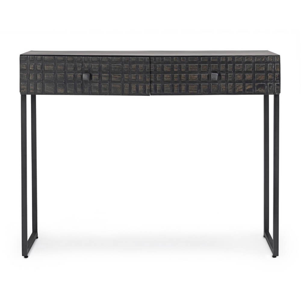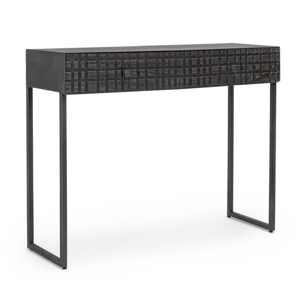 La Consolle 2 Cassetti Acciaio Nero Industriale da Interno – DANIELLE è una raffinata espressione di design industriale contemporaneo, ideale per valorizzare ingressi, soggiorni o spazi di lavoro dal carattere deciso. La struttura minimal in acciaio verniciato a polvere epossidica conferisce solidità e leggerezza visiva, mentre il frontale dei cassetti in legno di mango, rifinito con vernice a base di nitrocellulosa, si distingue per l’affascinante lavorazione geometrica a rilievo, che aggiunge profondità e personalità. Il colore nero opaco, uniforme e materico, amplifica il fascino urbano dell’arredo, rendendolo perfettamente integrabile in ambienti in stile industriale, contemporaneo o loft metropolitani. Ogni dettaglio della consolle DANIELLE è studiato per unire funzionalità e estetica: i due cassetti offrono uno spazio pratico per riporre piccoli oggetti quotidiani, mantenendo ordine e pulizia. Questo complemento d’arredo rappresenta una scelta originale e sofisticata per chi desidera un tocco distintivo, capace di impreziosire l’ambiente con sobrietà ed eleganza. La DANIELLE trova la sua massima espressione in ambienti moderni dal gusto deciso, dove la qualità dei materiali e il design autentico diventano protagonisti.