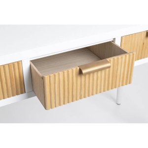 Elegante, funzionale e dal design contemporaneo, la Consolle 3 Cassetti Legno Bianco Moderna da Interno – CHARLOTTE è la soluzione ideale per chi desidera un complemento d’arredo raffinato capace di impreziosire qualsiasi ambiente della casa. Realizzata con una struttura solida in MDF, è impreziosita da cassetti in legno di paulownia con frontali scanalati effetto naturale che creano un delicato contrasto con il bianco laccato della superficie, donando carattere e leggerezza visiva. Le gambe affusolate in legno di pino verniciato a base d’acqua rafforzano il look moderno e slanciato, mentre le maniglie in acciaio aggiungono un tocco sofisticato e contemporaneo. Perfetta per l’ingresso, il soggiorno o la camera da letto, questa consolle moderna è pensata per offrire praticità e stile, con i suoi tre cassetti capienti ideali per riporre piccoli oggetti e mantenere l’ordine con eleganza. Il design minimalista ma ricercato della consolle CHARLOTTE si integra armoniosamente in contesti d’arredo scandinavi, nordici o moderni, regalando un tocco di stile pulito e funzionale che valorizza l’ambiente e arricchisce l’esperienza quotidiana.