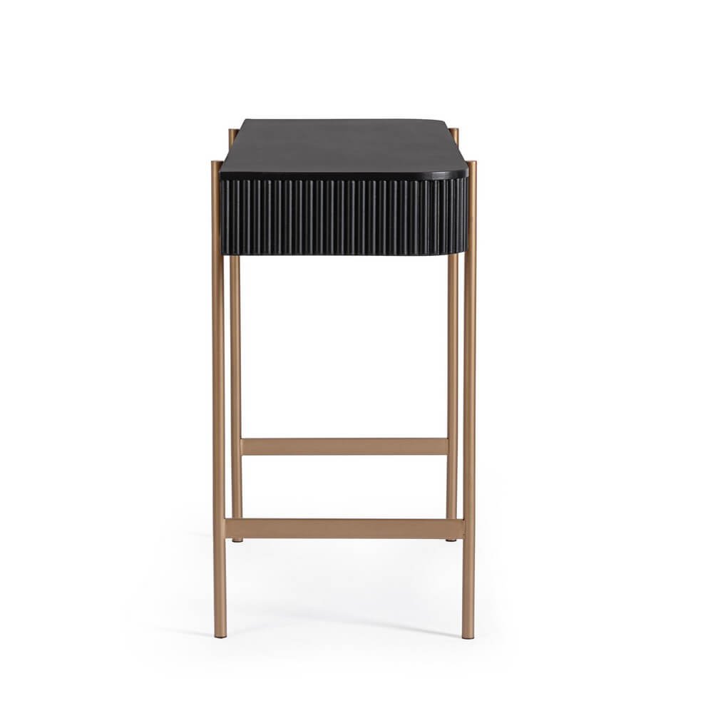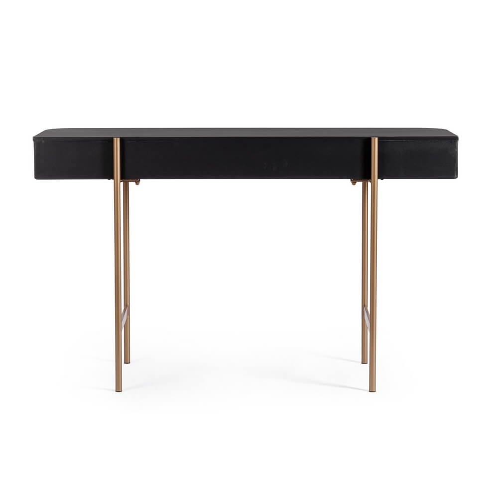 La Consolle Legno Nero Industriale da Interno 120×40 – LUCIA è un complemento d’arredo dal design ricercato e moderno, perfetto per valorizzare gli ambienti interni con uno stile elegante e contemporaneo. Il piano in MDF verniciato nero, con raffinata lavorazione a coste verticali, conferisce al mobile un aspetto deciso e di tendenza, mentre le gambe in acciaio verniciate a polvere epossidica color bronzo aggiungono un tocco industriale sofisticato. La linearità delle forme si unisce a un contrasto materico e cromatico che esprime carattere e personalità, rendendo questa consolle ideale per ingressi, living moderni o come scrittoio dal gusto minimal. L’effetto estetico è al tempo stesso solido e leggero, grazie alla struttura snella ma robusta, che valorizza la qualità dei materiali e la cura dei dettagli. La Consolle LUCIA si inserisce con armonia in contesti di arredo industrial chic, contemporaneo o urban, offrendo una superficie funzionale senza rinunciare all’impatto visivo. La sua presenza discreta ma distintiva arricchisce l’ambiente, offrendo un’esperienza d’uso raffinata e versatile.