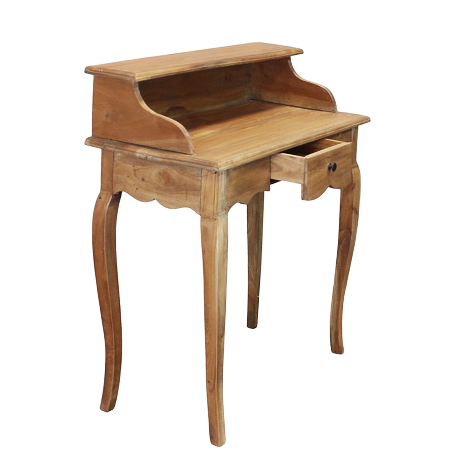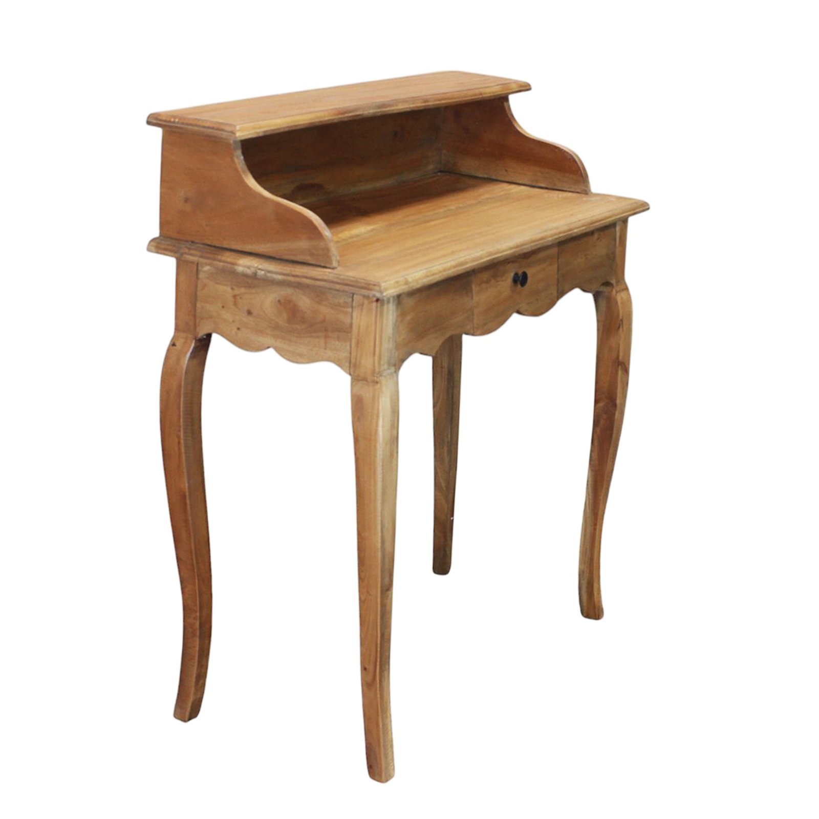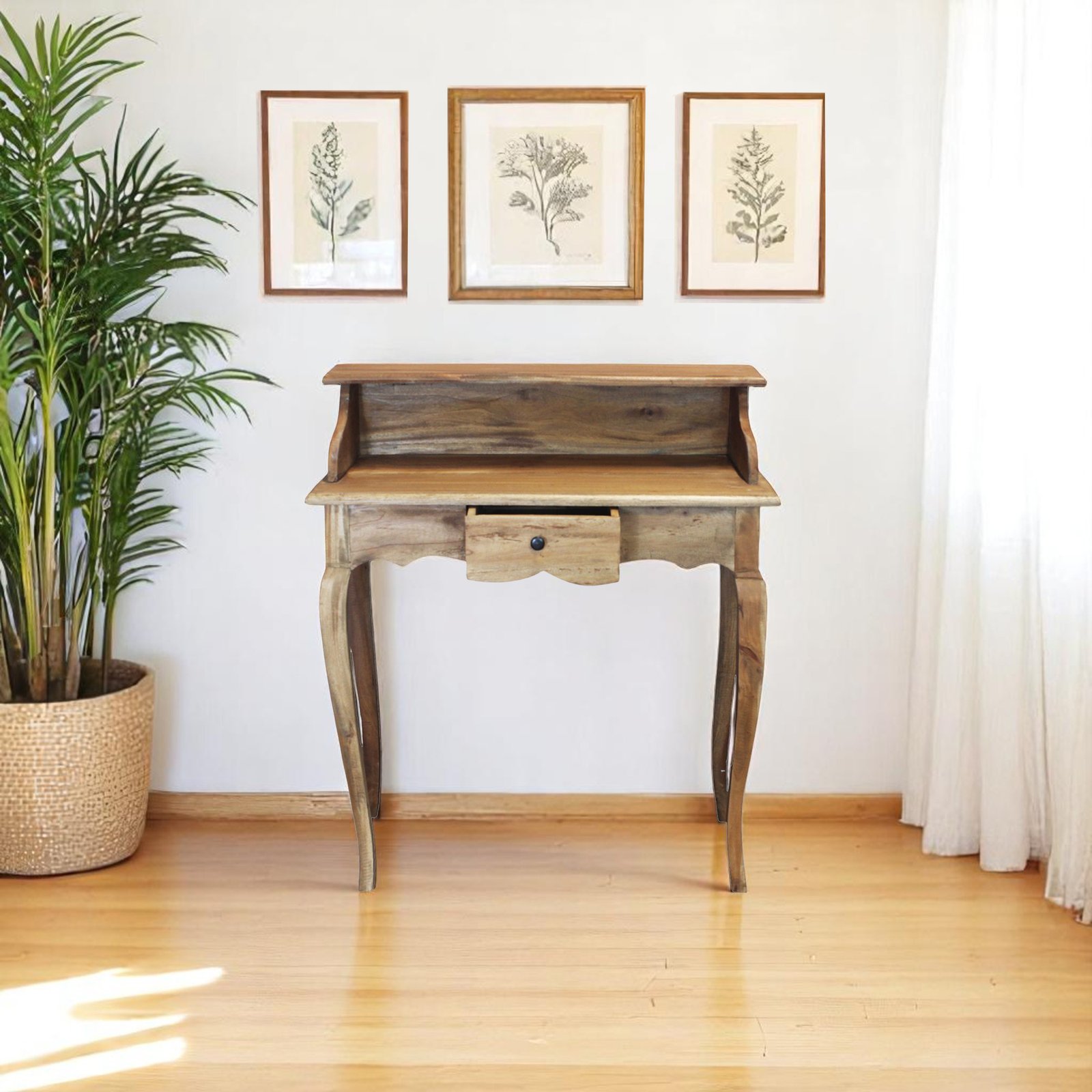 Lo scrittoio in legno RHOECUS è un elegante elemento d’arredo in stile arte povera, ideale per impreziosire ambienti raffinati come camere d’hotel o angoli lettura domestici. Realizzato in pregiato legno di mogano, si distingue per la qualità dei materiali e per la cura artigianale dei dettagli, come il profilo mosso nella parte inferiore, il cassettino centrale con pomello in metallo e le gambe finemente sagomate che ne evocano un gusto classico e romantico. Il piano rialzato con spalle laterali arrotondate offre un ulteriore livello d’appoggio funzionale, mentre la finitura in caldo marrone naturale esalta le venature del legno, donando calore e autenticità alla composizione. Con dimensioni compatte (80x40x92 cm), lo scrittoio RHOECUS coniuga estetica e praticità in uno spazio contenuto, perfetto per chi cerca un tavolo da scrittura fisso che valorizzi l’ambiente con un tocco di tradizione e charme antico. Pensato per offrire una postazione raccolta e intima, questo scrittoio esprime al meglio il suo valore in contesti classici o rustici, regalando uno spazio personale dove riscoprire il piacere della scrittura o del relax.