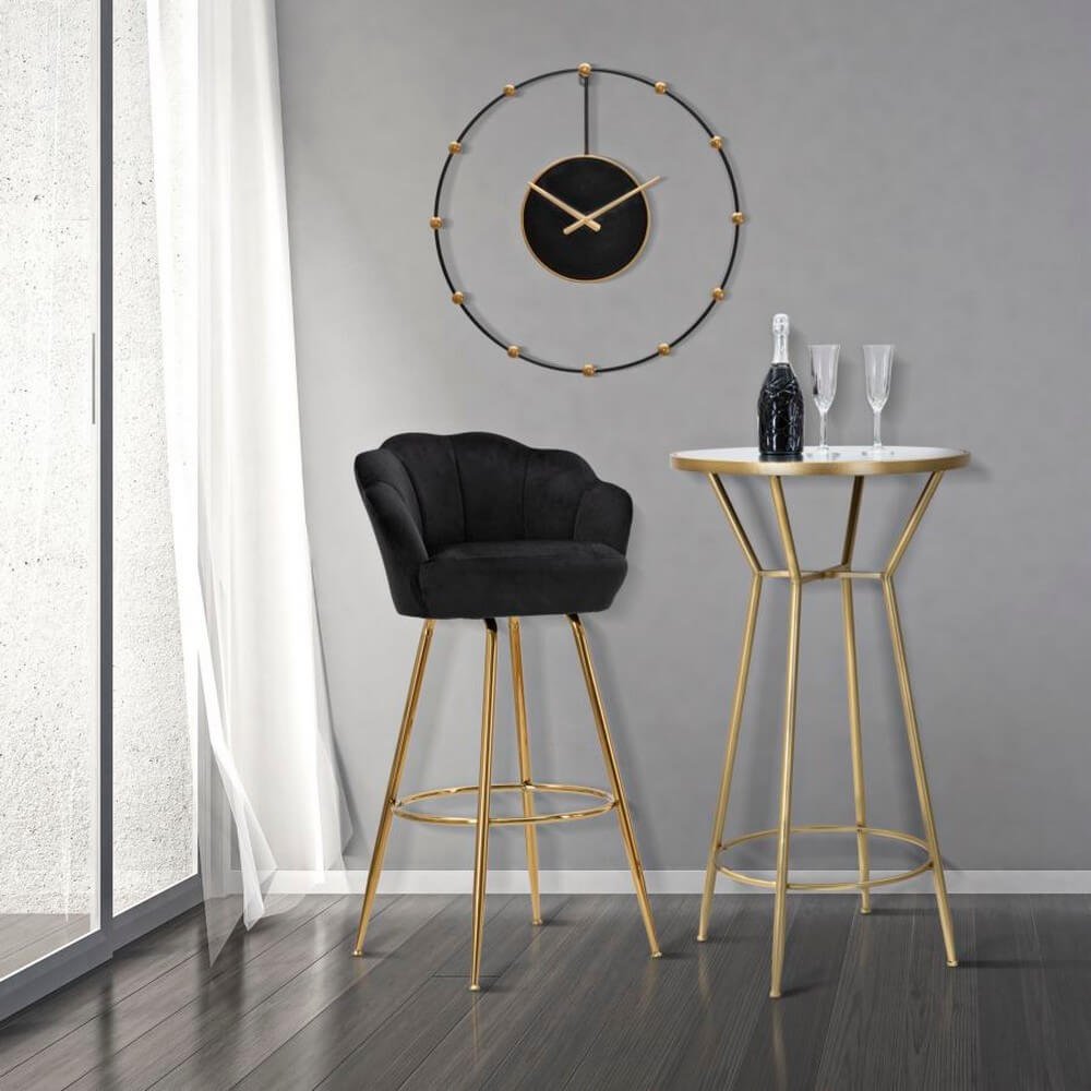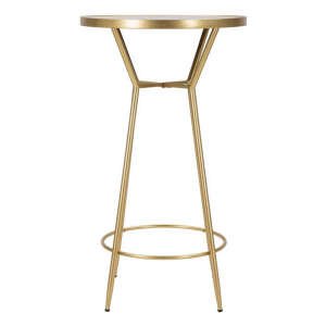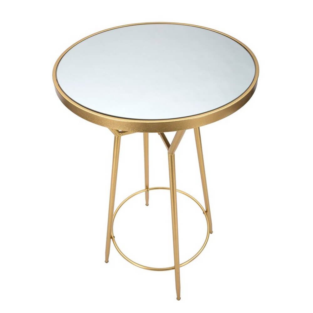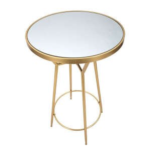 Semplice tavolo da bar rotondo in metallo dorato e piano in vetro a specchio. Design essenziale, lineare e pulito per donare con semplicitร un tocco glam di classe all’angolo bar della tua casa.
