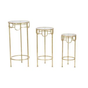 Tris di tavolinetti porta telefono rotondi in metallo dorato con piano in vetro trasparente. Splendidi tavolinetti dalle sottili forme metalliche con top trasparente. Il giusto equilibrio tra stile retro e glam contemporaneo