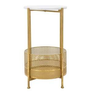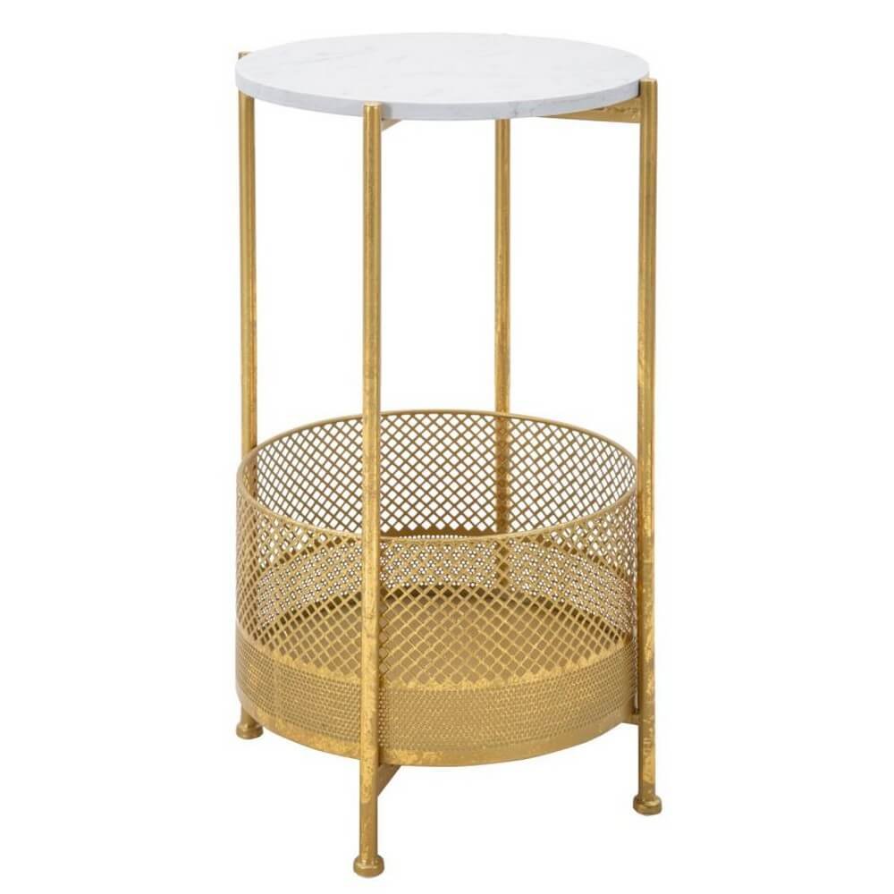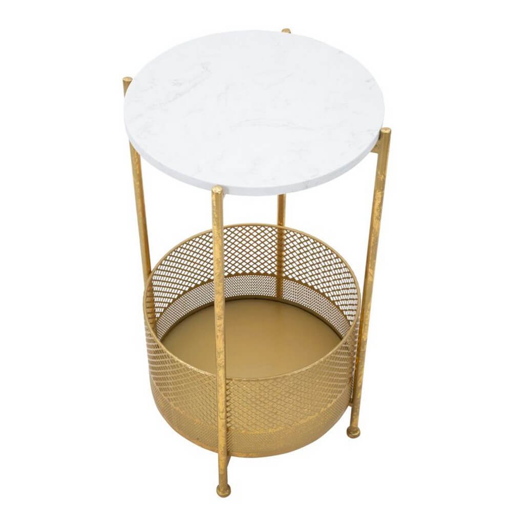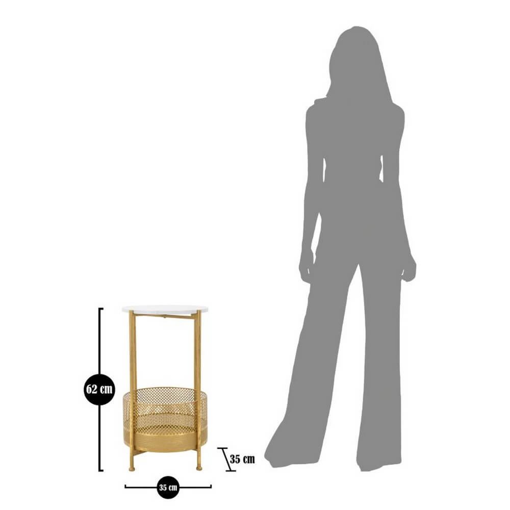 Elegante tavolinetto in metallo dorato con piano in finto marmo bianco con contenitore portaoggetti finemente intagliato sul piano inferiore. Le linee semplici ed eleganti lo rendono un oggetto perfetto per ogni ambiente.