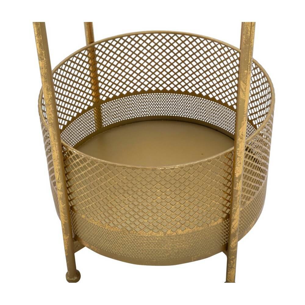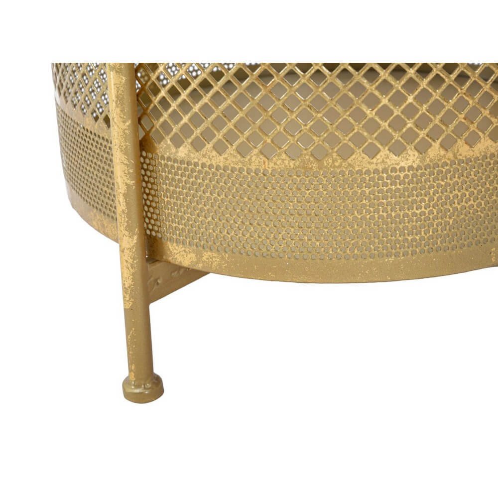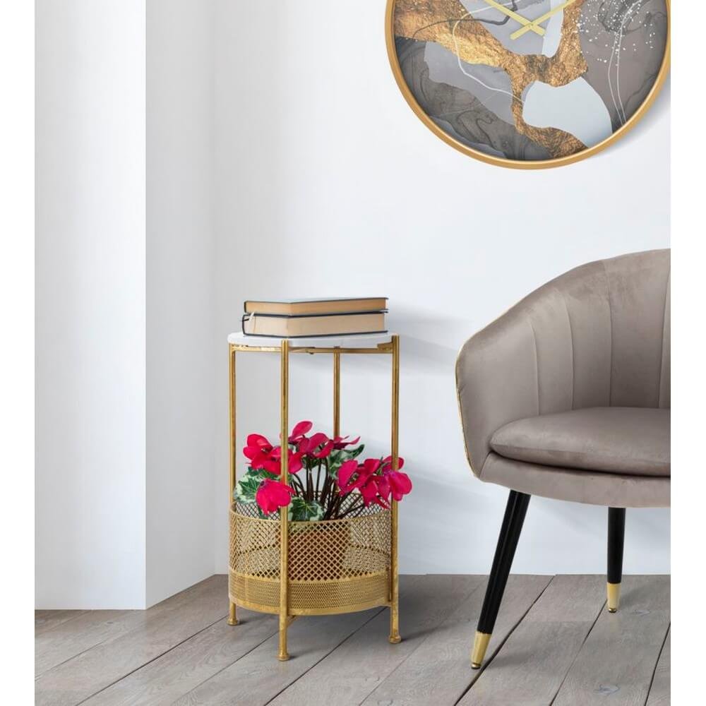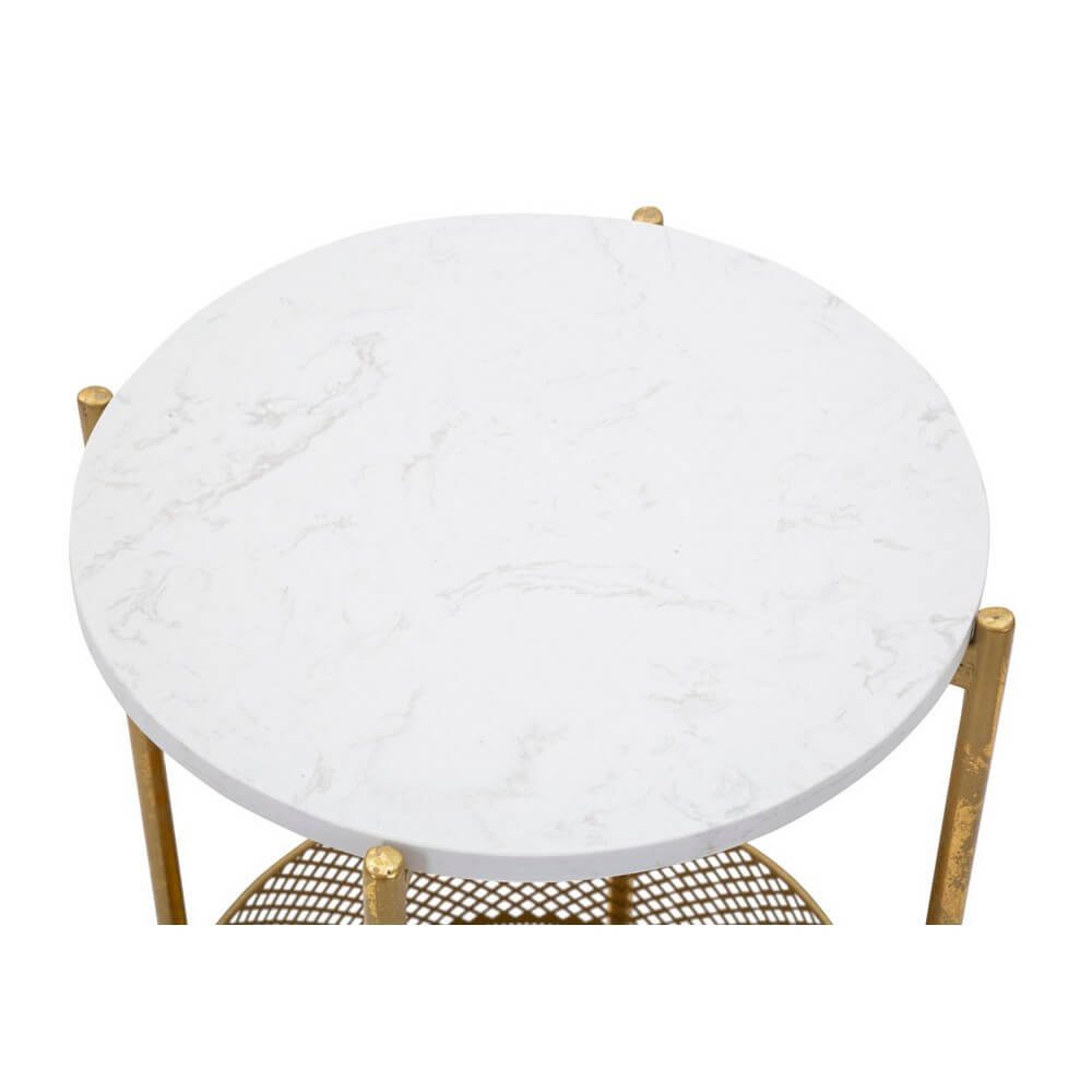Elegante tavolinetto in metallo dorato con piano in finto marmo bianco con contenitore portaoggetti finemente intagliato sul piano inferiore. Le linee semplici ed eleganti lo rendono un oggetto perfetto per ogni ambiente.