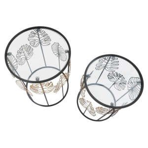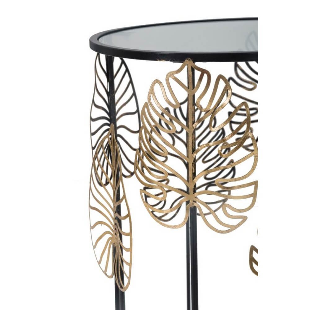 Elegante coppia di tavolinetti rotondi con struttura in metallo nero e piano in vetro. Le decorazioni a forma di foglie dorate ispirate alla natura donano un tocco di classe ad ogni ambiente.