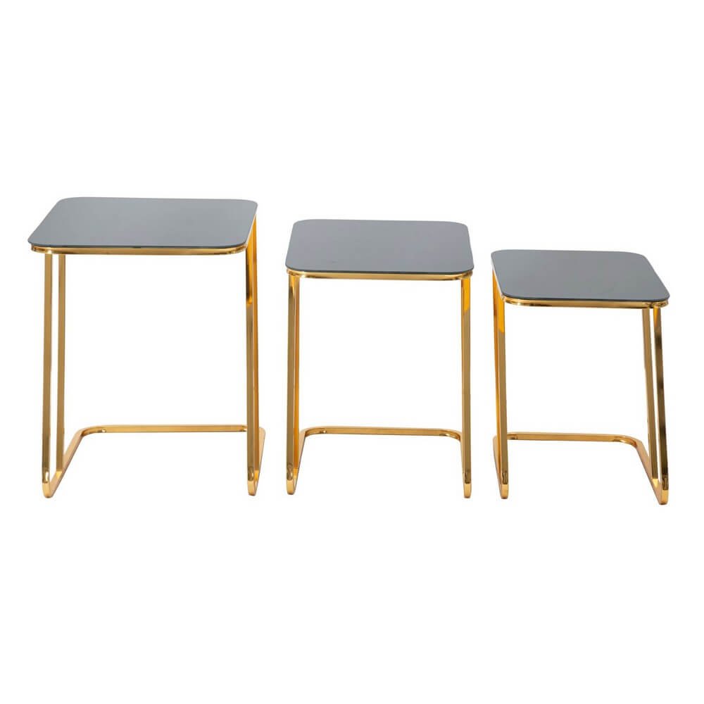 Set di 3 tavolinetti quadrati in metallo dorato con piano in vetro nero. Il design essenziale ma raffonato dona un tocco di classe ad ogni ambiente.