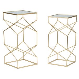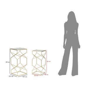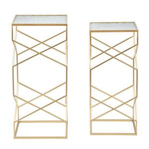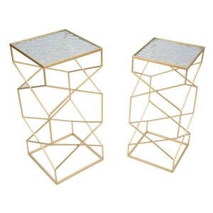 Coppia di tavolinetti quadrati in metallo dorato dalle linee geometriche che creano un senso di profondità Completi di piano in vetro finemente lavorato.