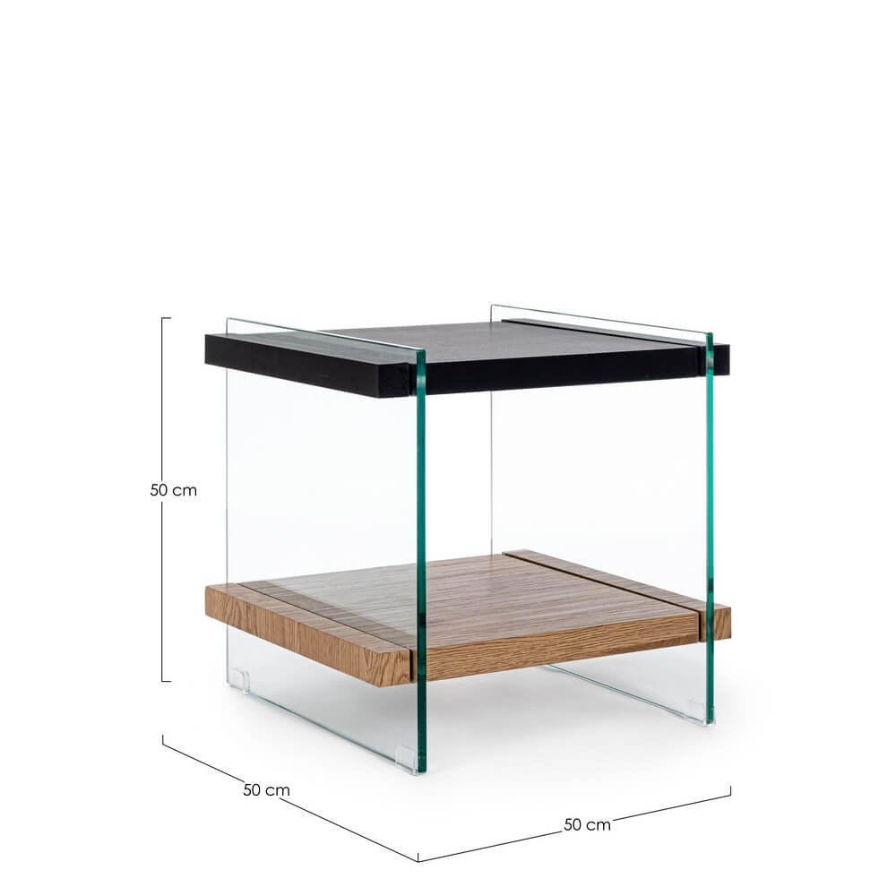 Il Tavolino 2 Piani Legno Nero Moderno da Interno 50×50 – SARA è una raffinata soluzione d’arredo pensata per chi desidera coniugare estetica contemporanea e funzionalità compatta negli ambienti living. Il design moderno e minimale si distingue per la combinazione equilibrata di materiali: i ripiani in MDF rivestiti con carta melaminica effetto legno donano un look sofisticato e autentico, mentre le eleganti pareti laterali in vetro trasparente non temperato da 12 mm conferiscono leggerezza visiva e un tocco di classe. Il contrasto tra il piano superiore nero e quello inferiore in finitura naturale effetto legno crea un gioco cromatico sobrio e ricercato, ideale per salotti moderni o spazi in stile contemporaneo. Con le sue dimensioni contenute di 50×50 cm, è perfetto come tavolino da salotto per appoggiare libri, riviste o piccoli complementi decorativi, con una portata massima di 2 kg per ripiano. Il Tavolino SARA valorizza ogni ambiente con discrezione ed eleganza, rappresentando una scelta ideale per chi cerca un elemento di design funzionale e dall’impatto visivo distintivo per arricchire il proprio spazio living.