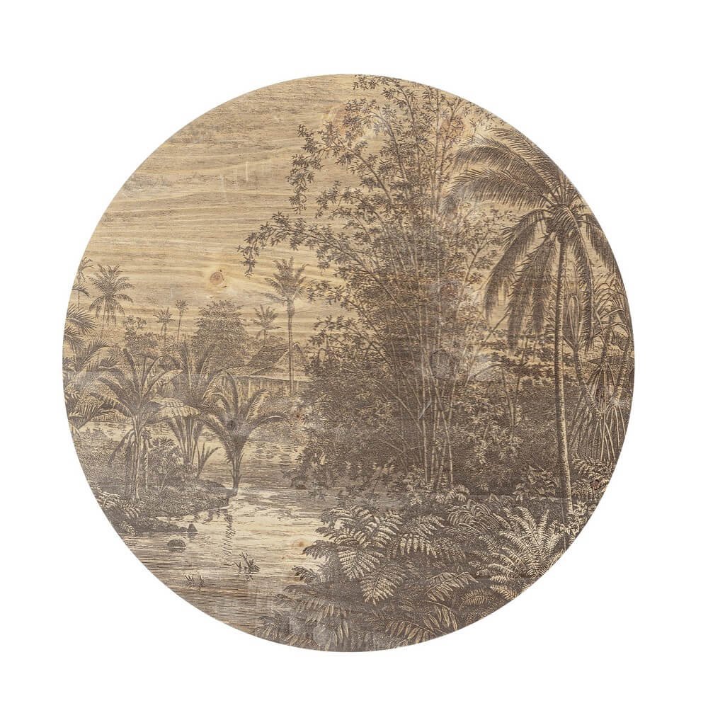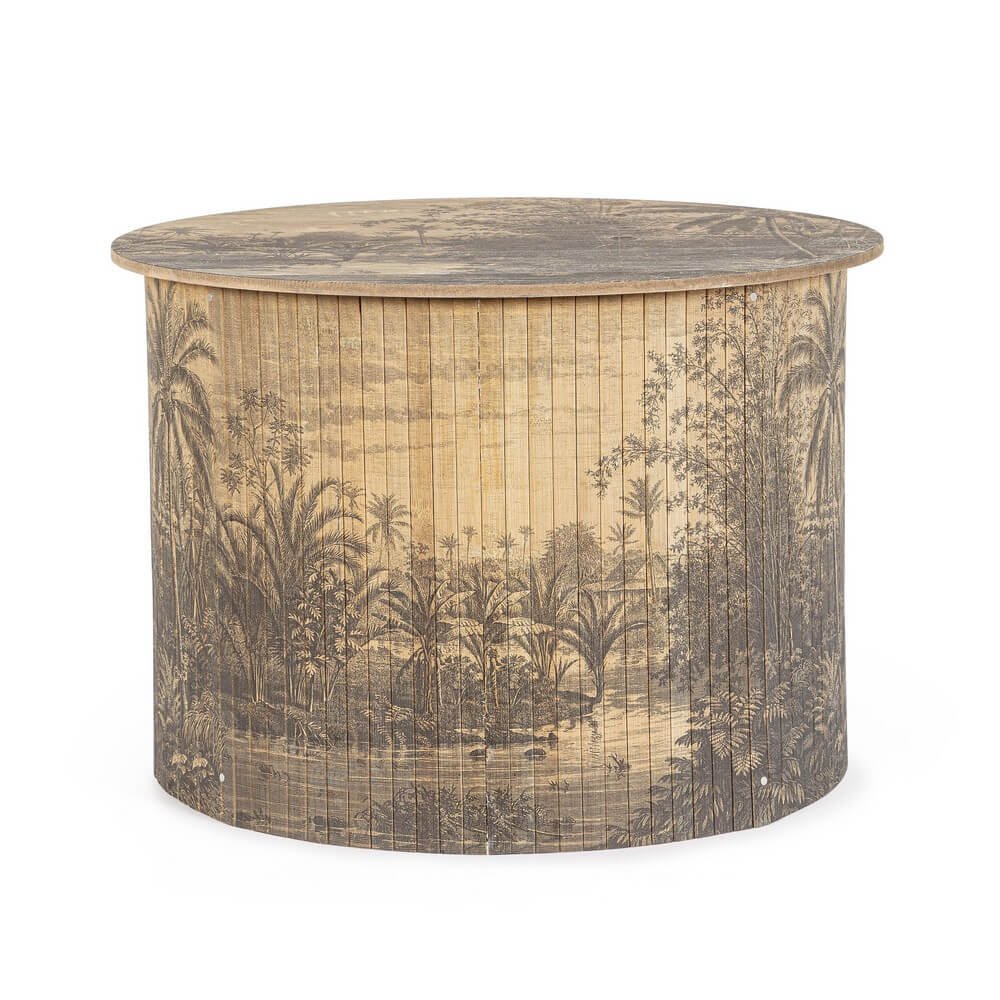 Il Tavolino Bamboo Legno Marrone Rustico da Interno Ø58 H40 – STARDUST è un complemento d’arredo affascinante che unisce funzionalità e stile in un’unica proposta dal carattere esotico e ricercato. Realizzato con una struttura in bambù naturale, piano e fondo in MDF e dettagli in acciaio, questo tavolino da salotto sorprende per la sua raffinata lavorazione artigianale e l’effetto decorativo unico: l’intera superficie cilindrica e il top sono impreziositi da una stampa panoramica in stile vintage che raffigura una lussureggiante scena tropicale, trasformando ogni dettaglio in un’opera d’arte. Il colore marrone caldo e l’estetica rustica lo rendono perfetto per ambienti accoglienti, etnici o boho chic, ma anche per spazi moderni in cerca di un accento naturale e distintivo. La combinazione di materiali solidi e naturali conferisce durabilità e stabilità senza rinunciare all’eleganza. Da assemblare facilmente, è ideale come tavolino da caffè, piano d’appoggio o punto focale in un salotto dallo stile personalizzato. Il Tavolino STARDUST esprime al meglio il suo valore in ambienti interni dove si vuole creare un’atmosfera calda, evocativa e rilassante.
