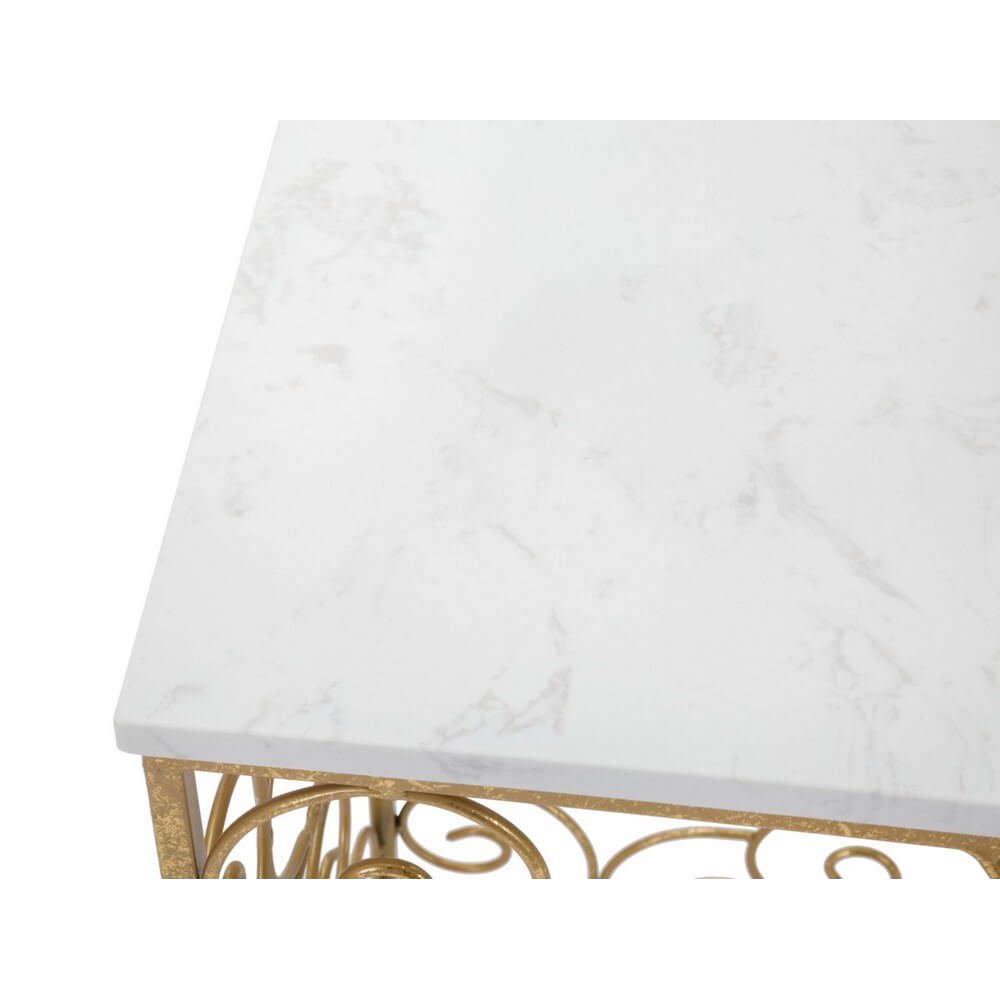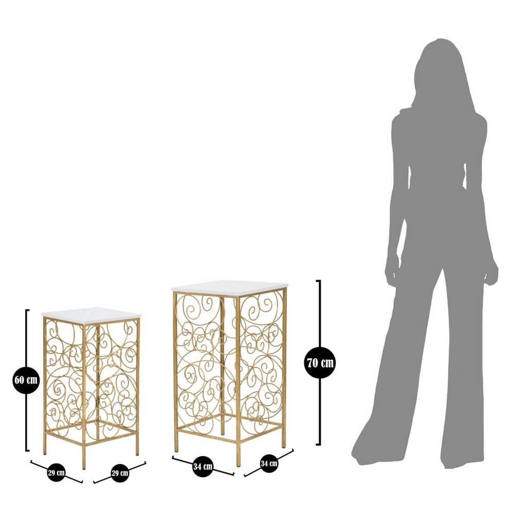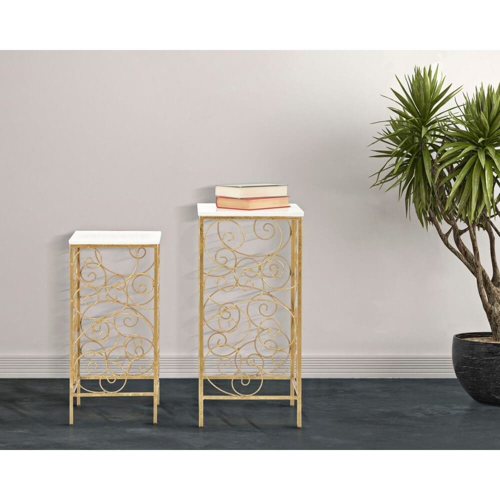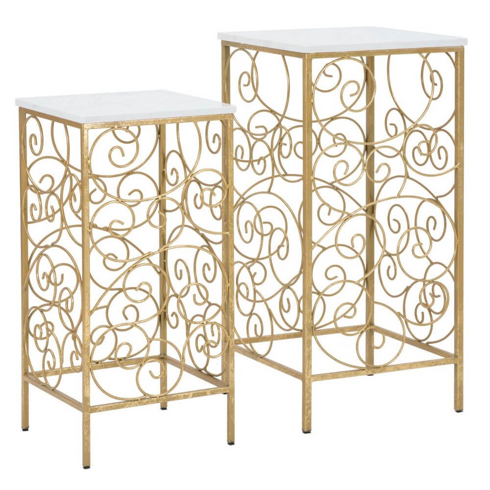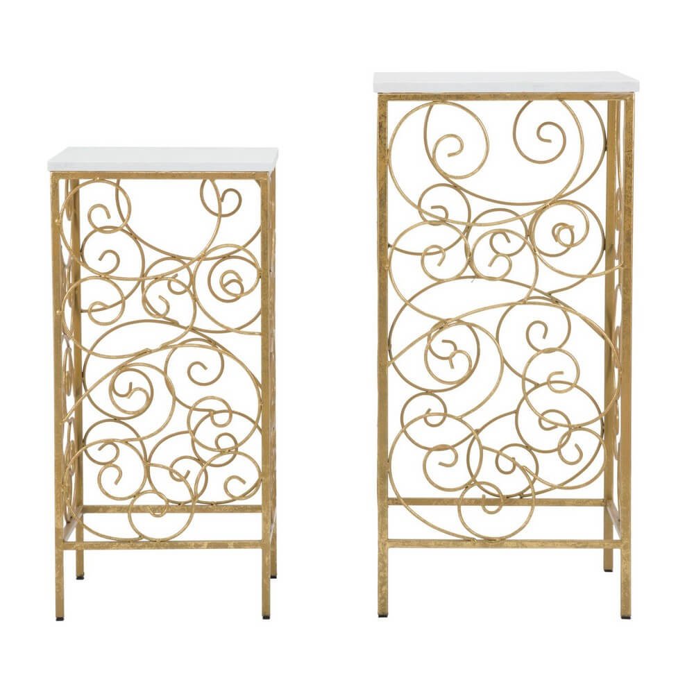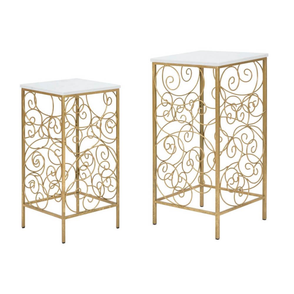 Coppia di tavolinetti quadrati in metallo dorato impreziositi dal piano in marmo bianco. Le particolari e morbide decorazioni geometriche donano un tocco di ricercatezza ad ogni ambiente.