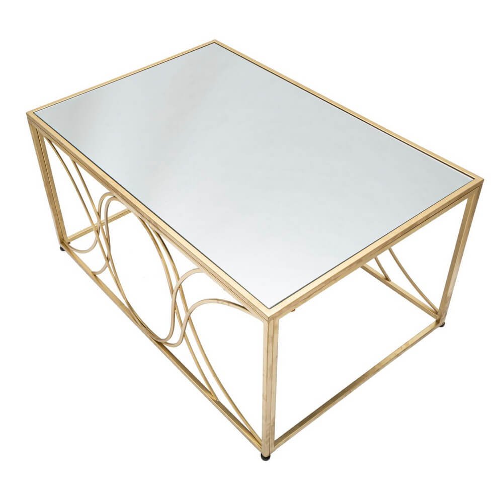 Elegante tavolo da caffè quadrato in metallo dorato con piano in vetro a specchio dalle linee morbide e tondeggianti. Eleganza e design si fondono in linee uniche per rendere speciale ogni ambiente.