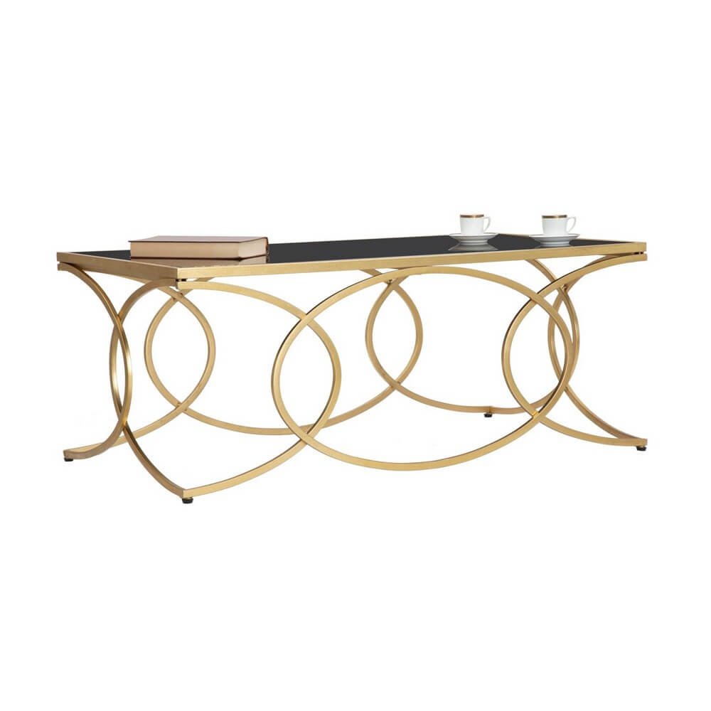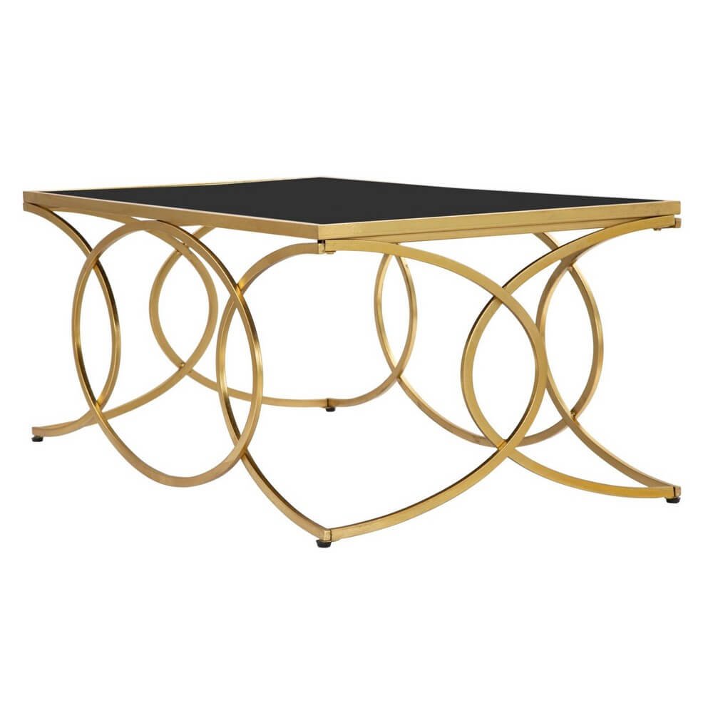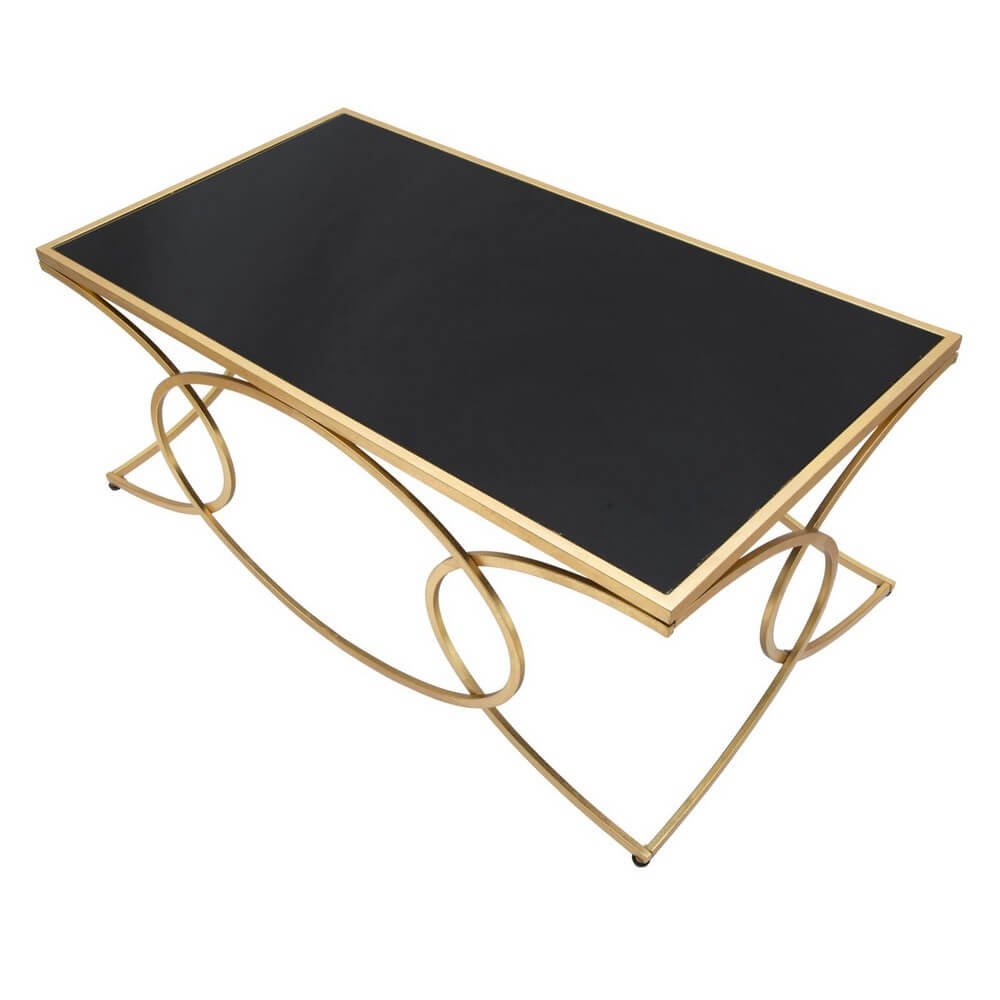 Elegante tavolo da caffé rettangolare in metallo dorato con ripiano in vetro temprato nero. I decori geometrici donano un tocco di classe e luminosità.