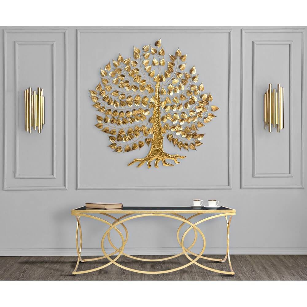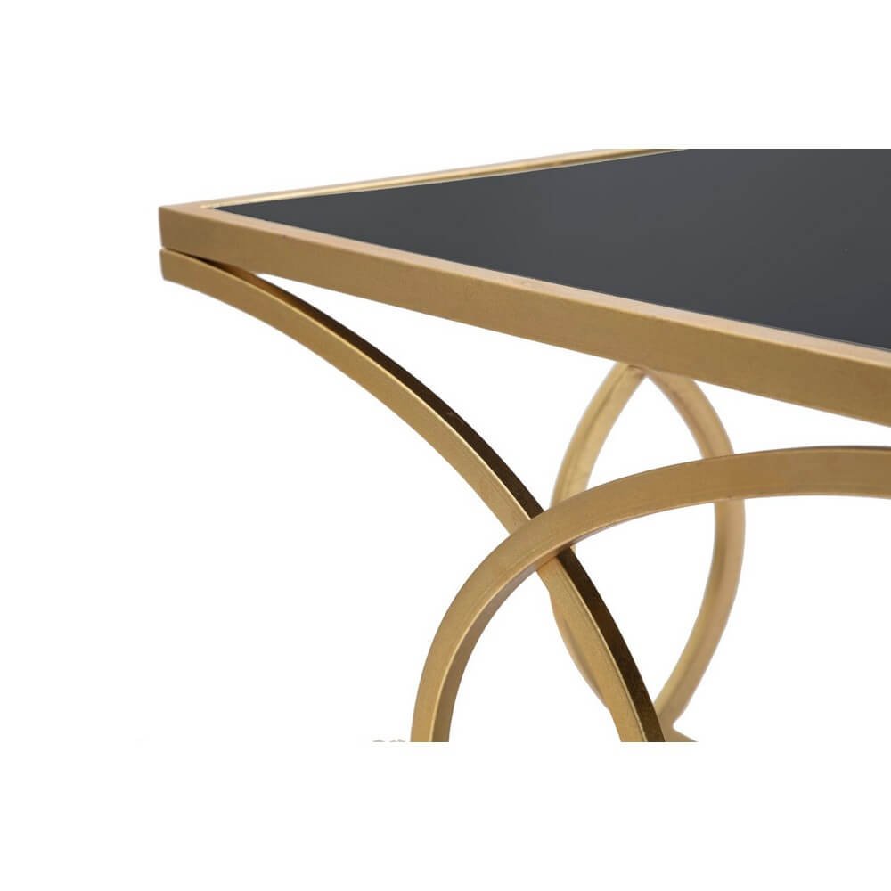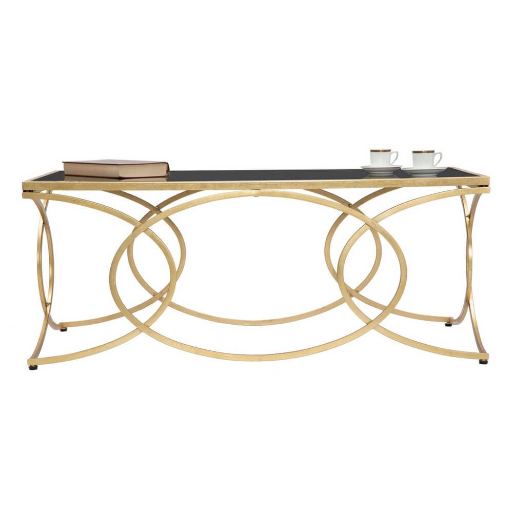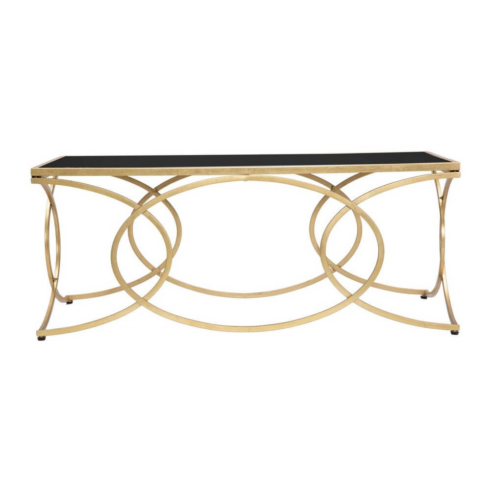 Elegante tavolo da caffé rettangolare in metallo dorato con ripiano in vetro temprato nero. I decori geometrici donano un tocco di classe e luminosità.
