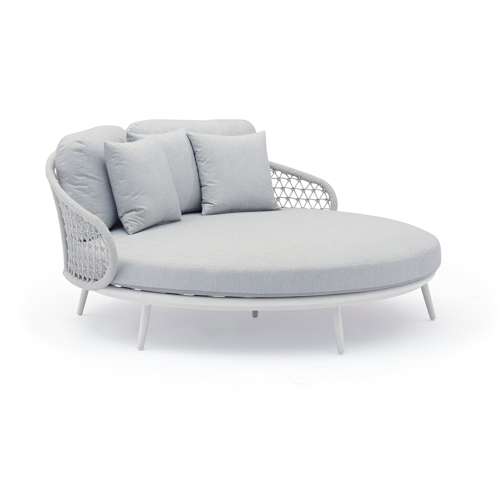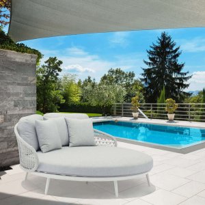 Il Divano da Giardino circolare con cuscini in Alluminio cm 183x180x84 – RAY rappresenta l’essenza dell’eleganza outdoor contemporanea. Pensato per arredare con raffinatezza terrazze, piscine o giardini di design, questo divano da giardino unisce una struttura in alluminio bianco resistente e leggera a una lavorazione in corda grigio mélange in textilene che aggiunge una texture sofisticata. I generosi cuscini con rivestimento in TPU idrorepellente color grigio chiaro offrono un comfort eccezionale, grazie allo spessore di 15 cm, rendendo il divano ideale per rilassarsi in tre persone. Lo stile moderno si fonde con una forma circolare avvolgente, enfatizzata da dettagli visivi accattivanti come la trama intrecciata dello schienale e le linee morbide della seduta. Perfetto per chi ricerca un arredo da esterno che combini funzionalità e stile, il divano RAY si distingue per la qualità dei materiali e l’estetica sobria e luminosa. È nel contesto di un elegante salotto all’aperto, magari a bordo piscina o sotto una pergola con vista panoramica, che questo divano esprime al meglio il suo carattere rilassante e ricercato.