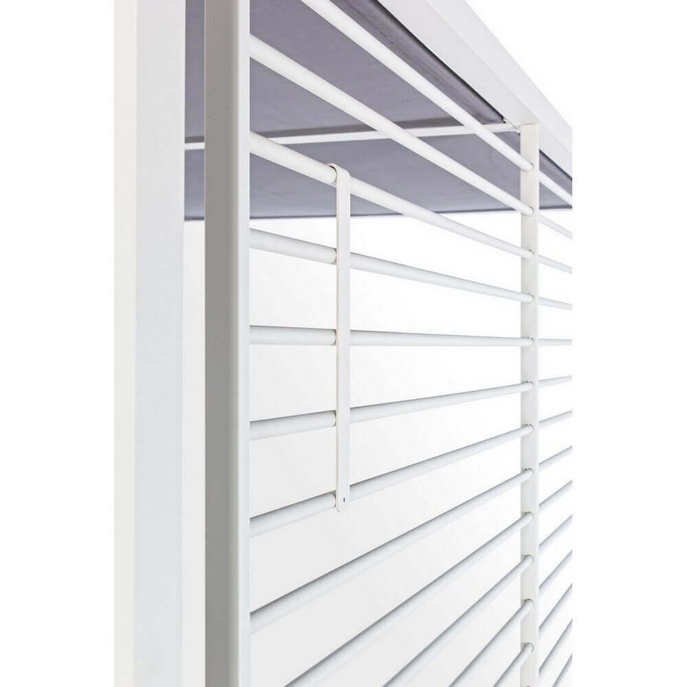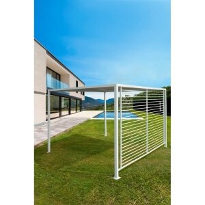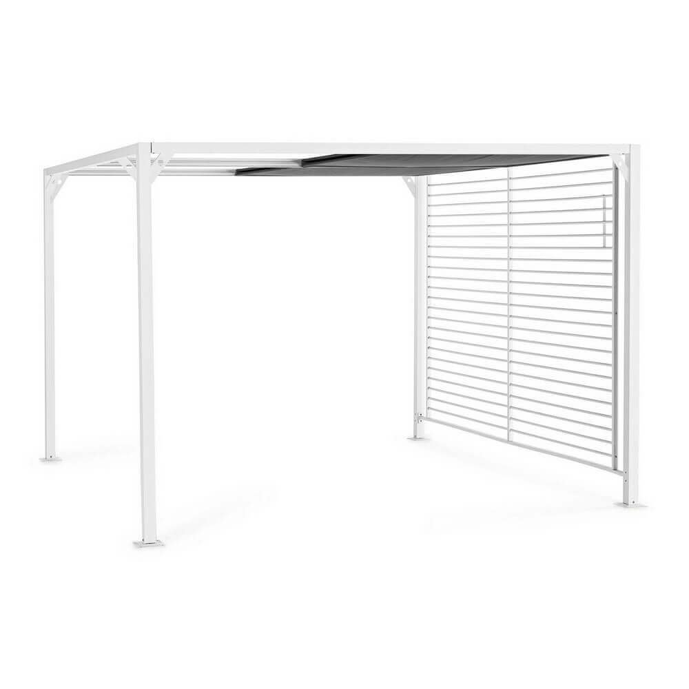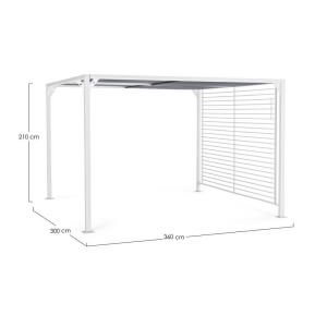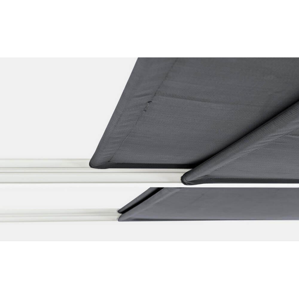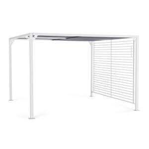 La struttura in alluminio verniciato a polvere (poliestere) con pali da 65×65 mm assicura resistenza, leggerezza e protezione contro la corrosione e le intemperie, mantenendo intatta nel tempo la qualità estetica e strutturale. Il tettuccio superiore scorrevole, in textilene grigio scuro, permette di regolare la copertura solare in base alle esigenze, offrendo sempre il giusto equilibrio tra ombra e luminosità.