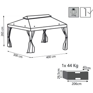 Il Gazebo da Giardino 3×4 in alluminio poliestere – GRANT è l’elegante soluzione outdoor per trasformare il tuo spazio verde in un’oasi di benessere e convivialità. Con una struttura solida in alluminio dalla finitura nera e un rivestimento in poliestere avorio da 180 gr per il telo superiore e 160 gr per le tende laterali, questo gazebo unisce estetica raffinata e funzionalità resistente. I colori antracite e beige creano un contrasto sobrio e moderno, perfetto per giardini arredati con stile contemporaneo o classico. Il design a due falde con telaio a vista conferisce leggerezza visiva e solidità architettonica, mentre le 4 tende e zanzariere integrate garantiscono una protezione ottimale dal sole e dagli insetti, migliorando il comfort in ogni occasione. Le dimensioni generose di 3×4 metri lo rendono ideale per ospitare pranzi all’aperto, momenti di relax o piccoli eventi tra amici. Il Gazebo GRANT esprime al meglio il suo valore in un contesto curato come un giardino, un bordo piscina o un’ampia terrazza, offrendo un rifugio ombreggiato dove vivere al meglio ogni stagione all’aria aperta.