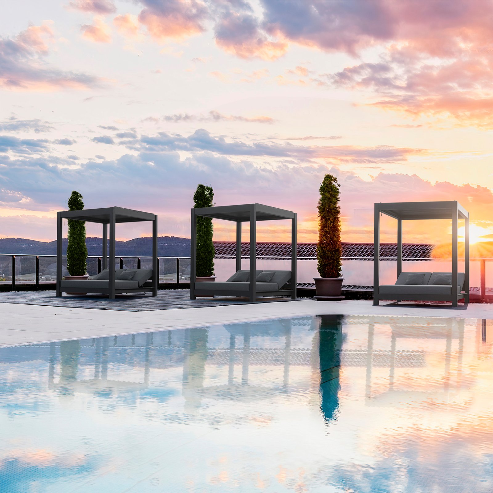 Il Gazebo letto da giardino con led – XANDER rappresenta l’eccellenza dell’arredo outdoor moderno, pensato per chi desidera unire comfort, design e funzionalità in un’unica soluzione esclusiva. Con la sua struttura fissa in alluminio verniciato color antracite, resistente e di alta qualità, e i morbidi cuscini in poliestere grigio, XANDER offre un’estetica elegante e minimale, perfetta per ambienti contract di pregio come hotel, lounge o aree benessere all’aperto. Le dimensioni generose (180 x 205 x 200 cm) garantiscono il relax ideale per due persone, mentre il tettuccio apribile consente di modulare facilmente l’ombra in base all’intensità del sole. L’illuminazione a LED integrata lungo il perimetro interno del tetto aggiunge un tocco sofisticato, creando un’atmosfera suggestiva anche di sera. Il Gazebo XANDER esprime pienamente la sua raffinatezza in contesti moderni, dove stile e funzionalità si fondono per offrire un’esperienza di benessere unica, trasformando ogni momento di relax all’aperto in un rituale di comfort e bellezza.