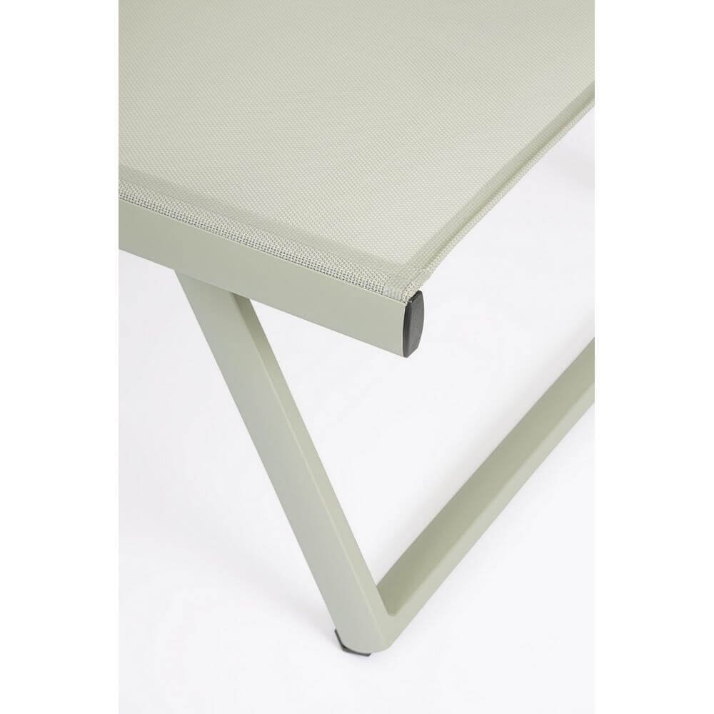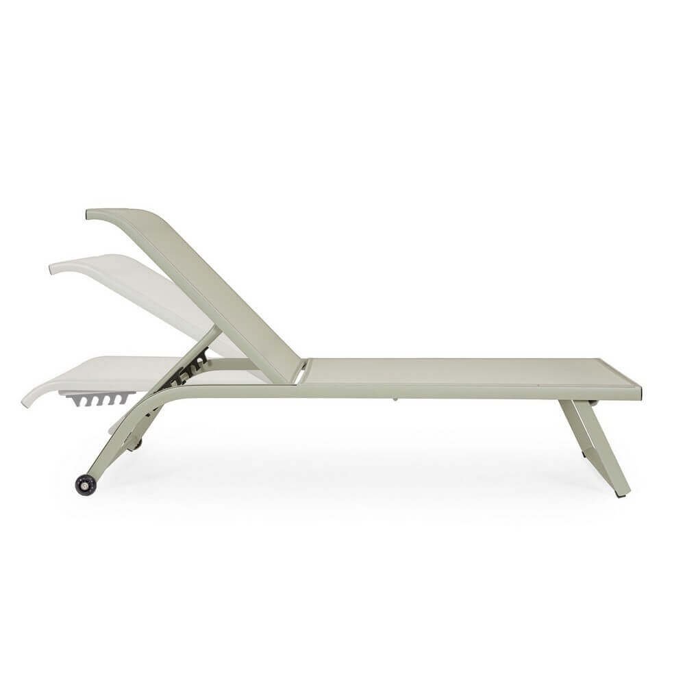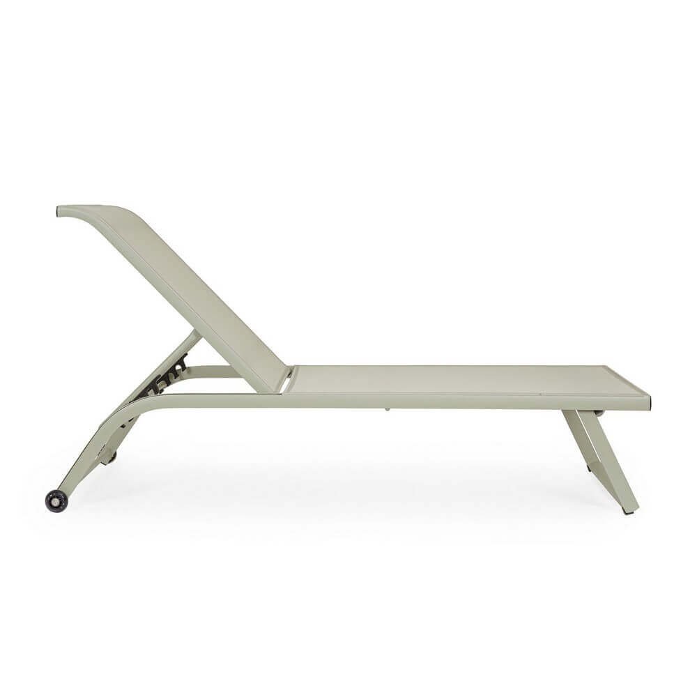 Struttura in alluminio, verniciato a polvere (poliestere). seduta e schienale rivestiti in textilene 2×1 (610g/m2). schienale reclinabile (4 posizioni). viteria in acciaio galvanizzato. ruote da assemblare in plastica (pu).