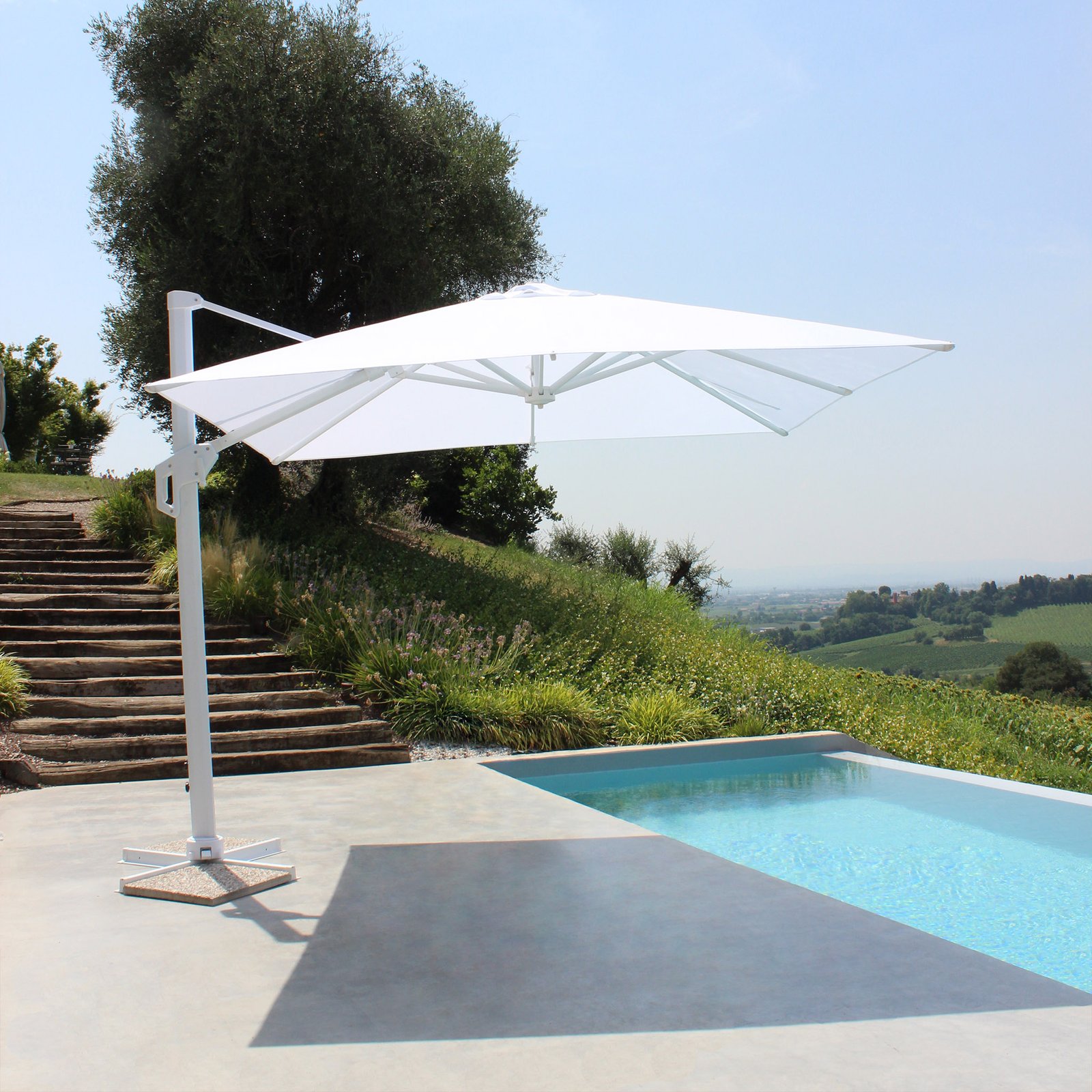 L’ombrellone decentrato 3×4 in alluminio HIERON è la soluzione ideale per arredare con eleganza e funzionalità spazi outdoor come ristoranti, terrazze o giardini moderni. Caratterizzato da una struttura robusta e contemporanea con palo laterale in alluminio girevole da 62×102 e 38×52 mm, questo ombrellone unisce praticità e design. Il telo in poliestere bianco da 250 gr conferisce un aspetto sobrio e luminoso, perfetto per ambientazioni raffinate, ed è dotato di sistema antivento per una maggiore stabilità anche nelle giornate più ventilate. Le generose dimensioni di 300×400 cm e l’altezza di 273 cm garantiscono una copertura ampia e omogenea, ideale per offrire riparo e comfort agli ospiti in contesti professionali o privati. Lo stile moderno e la scelta di materiali resistenti fanno dell’ombrellone a braccio HIERON un elemento distintivo dell’arredo giardino, pensato per durare nel tempo e valorizzare ogni ambiente open air con classe. Perfetto per creare atmosfere rilassanti e protette sotto il sole, questo ombrellone esprime al meglio la sua funzionalità e bellezza nei contesti di accoglienza più esigenti.