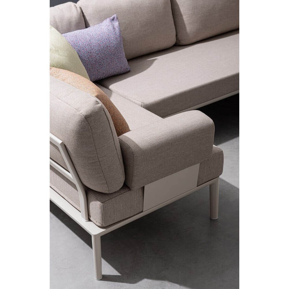 Struttura in alluminio verniciata a polvere (poliestere). bracciolo imbottito con rivestimento in tessuto idrorepellente olefin (100% polipropilene). viteria in acciaio inossidabile.