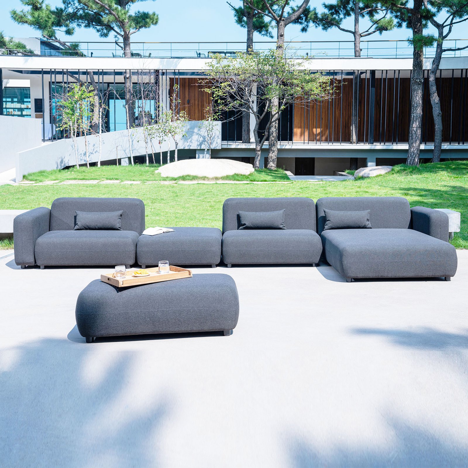 Il Divano da giardino modulo centrale PETRA rappresenta l’equilibrio ideale tra design moderno e funzionalità outdoor. La struttura in alluminio offre solidità e resistenza agli agenti atmosferici, mentre i morbidi cuscini rivestiti in poliestere, in tonalità raffinate di grigio antracite, garantiscono comfort e praticità in ogni contesto. Le forme generose e pulite, caratterizzate da linee arrotondate e un’imbottitura accogliente, conferiscono a questo modulo un’estetica contemporanea ed elegante, perfetta per valorizzare gli spazi esterni di hotel di lusso, terrazze panoramiche o salotti da giardino dal gusto minimal. Il design modulare permette un’ampia libertà compositiva, rendendo il modulo centrale PETRA un elemento versatile, adatto a creare configurazioni personalizzate in base alle esigenze dello spazio e dell’ospitalità. Perfetto per due persone, trasmette una sensazione di relax e intimità, trasformando ogni ambiente in un’area lounge esclusiva dove vivere momenti di comfort all’aria aperta.