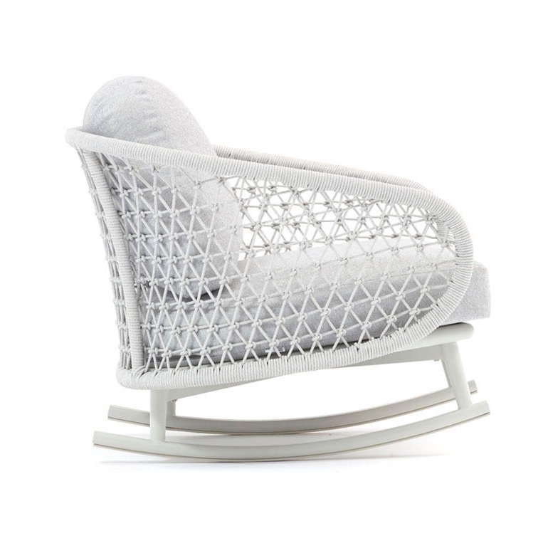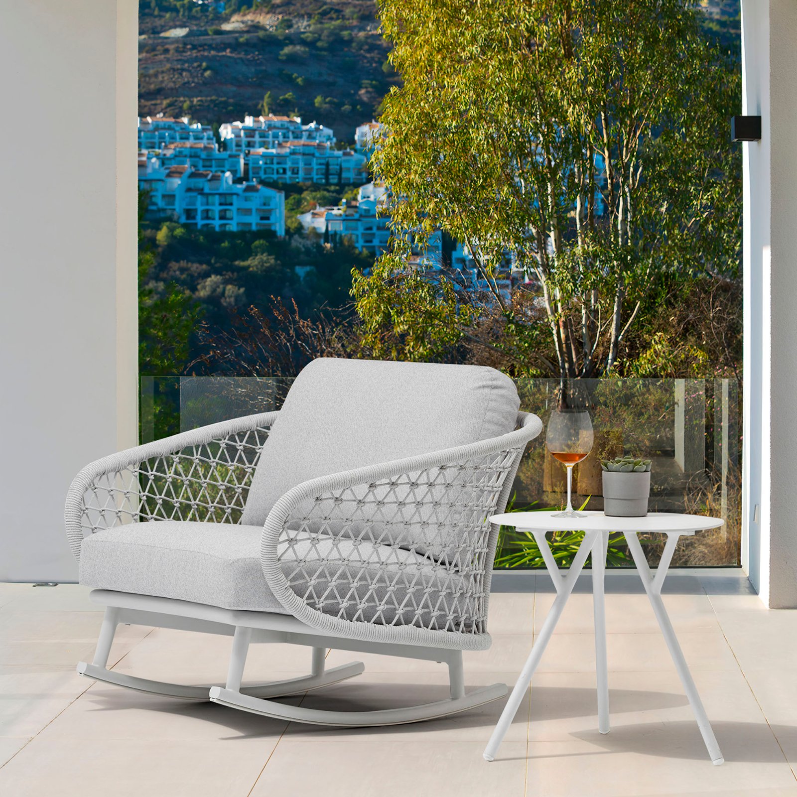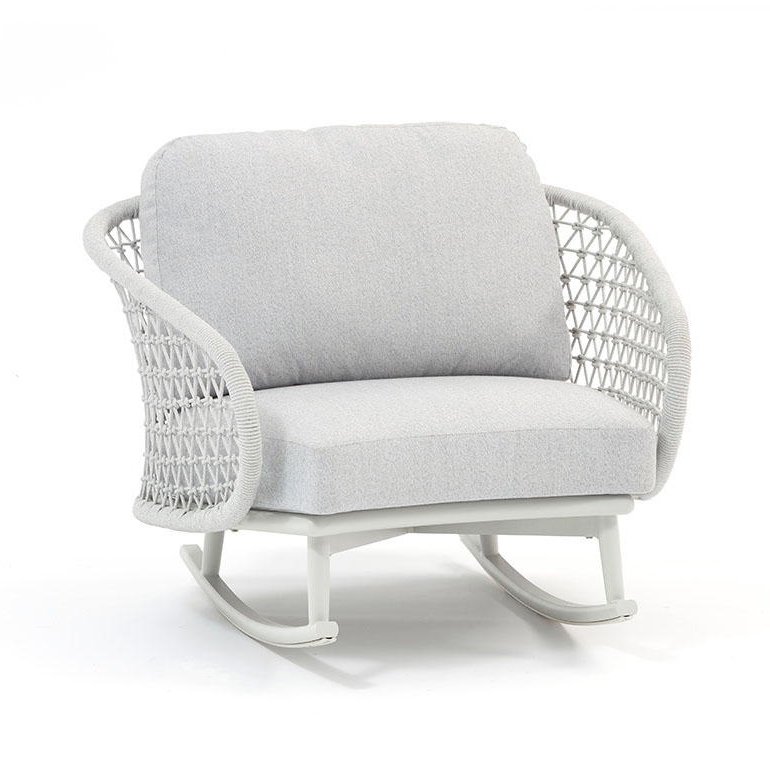 La Poltrona a dondolo da giardino PERRIN rappresenta la sintesi perfetta tra stile moderno, comfort e materiali resistenti, pensata per valorizzare con eleganza qualsiasi salotto da esterno. Caratterizzata da una struttura in alluminio verniciato bianco, questa poltrona unisce leggerezza e durata nel tempo, mentre la corda grigio mélange intrecciata lungo i braccioli offre un tocco artigianale e di design contemporaneo. I generosi cuscini in grigio chiaro, rivestiti in poliestere con trattamento TPU idrorepellente, assicurano un comfort ottimale anche in ambienti esterni esposti alle intemperie. Le dimensioni generose (95 x 95 x 70,5 cm) e la base a dondolo la rendono ideale per concedersi momenti di relax assoluto in giardino, a bordo piscina o nelle aree lounge di hotel e strutture ricettive di fascia alta. L’estetica ariosa, i toni neutri e sofisticati e la cura per ogni dettaglio rendono la poltrona PERRIN non solo un complemento d’arredo funzionale, ma una vera e propria esperienza di benessere, capace di trasformare ogni spazio outdoor in un’oasi di tranquillità e stile.