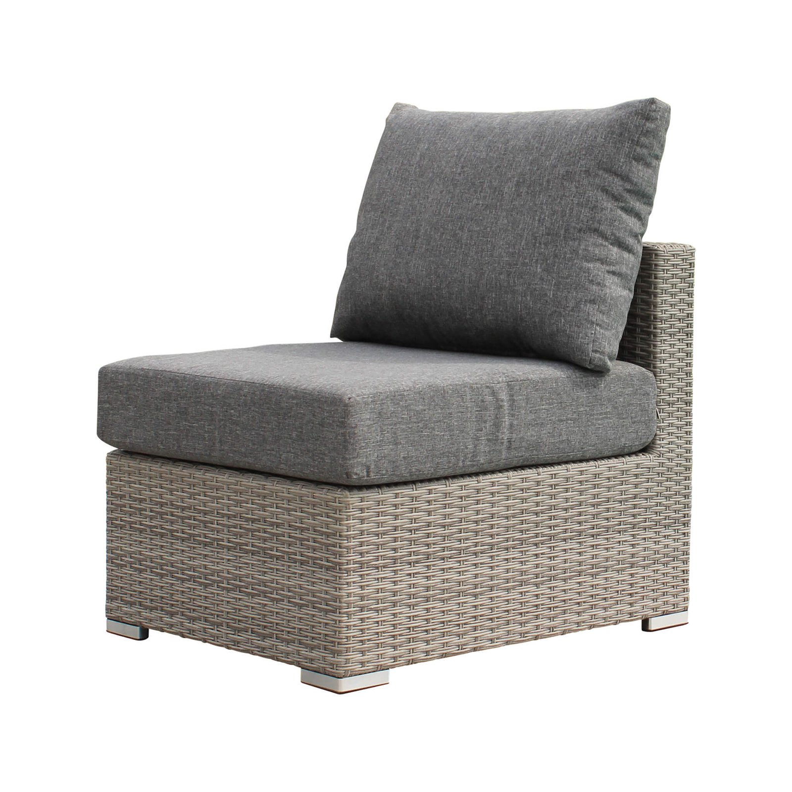 La poltrona centrale per salotto componibile CABANA è la scelta perfetta per chi desidera arredare con stile e funzionalità spazi outdoor come terrazze, giardini o bordi piscina. Appartenente alla categoria dei salotti da giardino, questo arredo si distingue per il design moderno e l’estetica raffinata, con una struttura compatta (62 x 77 x 65 cm h) ideale per combinazioni versatili e modulari. La base in resistente alluminio è rivestita da wicker intrecciato in tonalità grigio chiaro, un materiale elegante e durevole dotato di protezione UV, che garantisce lunga tenuta anche sotto il sole diretto. I cuscini spessi 12 cm, rivestiti in un tessuto grigio scuro dal look sobrio e contemporaneo, offrono un comfort superiore e invitano al relax. Lo stile pulito e naturale della poltrona CABANA si adatta perfettamente a contesti d’arredo moderni o boho-chic, aggiungendo un tocco sofisticato senza rinunciare alla praticità. Pensata per essere parte di un sistema componibile, questa seduta si rivela estremamente funzionale per creare salotti personalizzati all’aperto, trasformando ogni momento di pausa in un’esperienza elegante e rilassante a contatto con la natura.