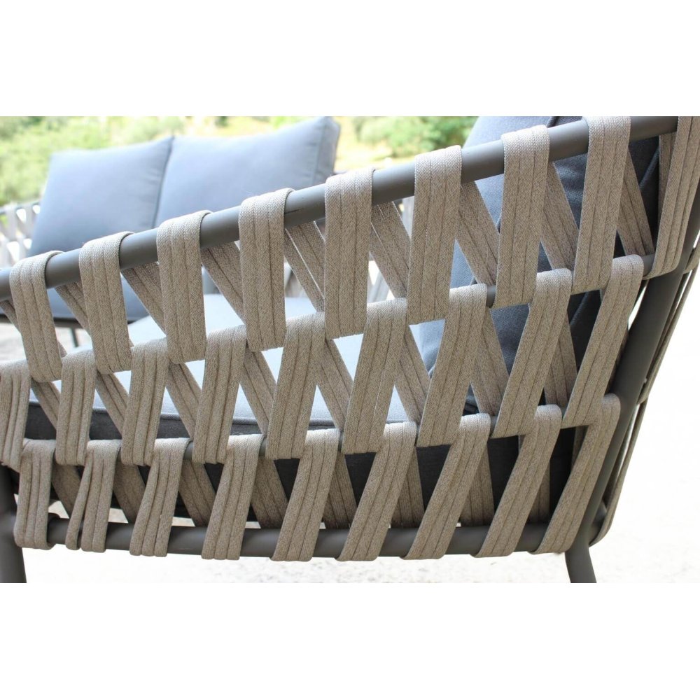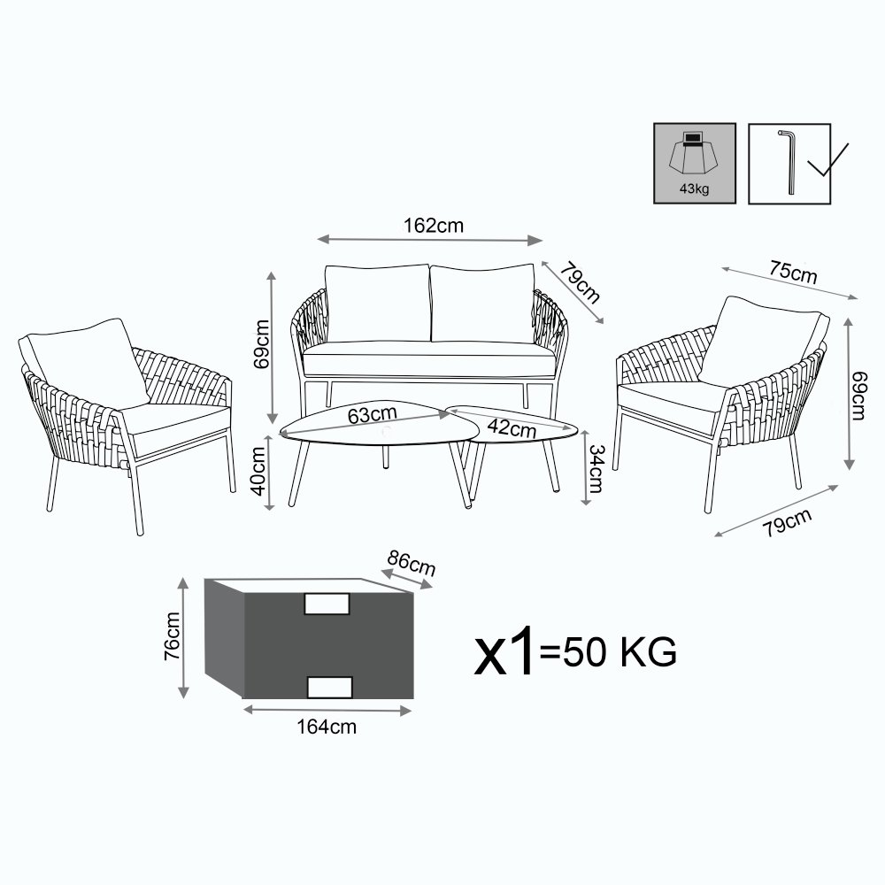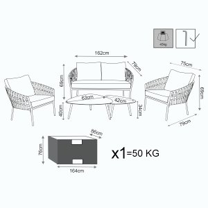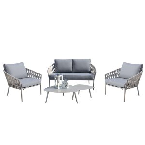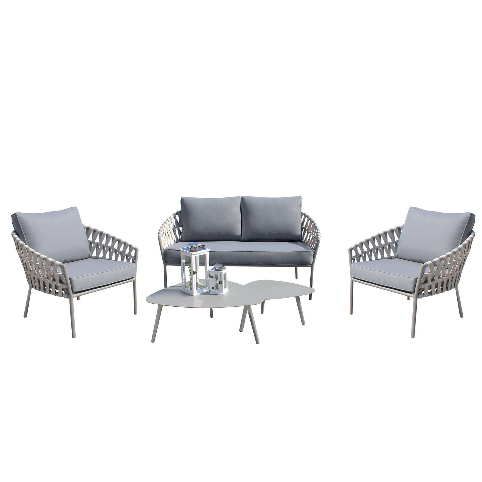Il Salotto da Giardino 4 posti con cuscini in Alluminio Corda – DILLON è la sintesi perfetta tra design moderno e funzionalità outdoor. Grazie alla sua elegante struttura in alluminio rivestita da una raffinata corda intrecciata piatta di colore grigio scuro con protezione UV, questo salotto da giardino unisce resistenza agli agenti atmosferici e stile contemporaneo. I cuscini spessi 10 cm, in tonalità grigio profondo, offrono un comfort superiore, mentre la composizione include due ampie poltrone, un comodo divanetto a due posti e due tavolini dal gusto minimale, ideali per creare un angolo relax raffinato. Le linee geometriche, i materiali di alta qualità come il wicker e l’alluminio, e la palette cromatica neutra lo rendono perfetto per arredare con personalità terrazzi, verande o giardini dal gusto moderno e ricercato. Il Salotto da Giardino DILLON valorizza ogni spazio esterno offrendo un’atmosfera rilassata e accogliente per momenti conviviali o pause all’aria aperta all’insegna del comfort e dell’eleganza.