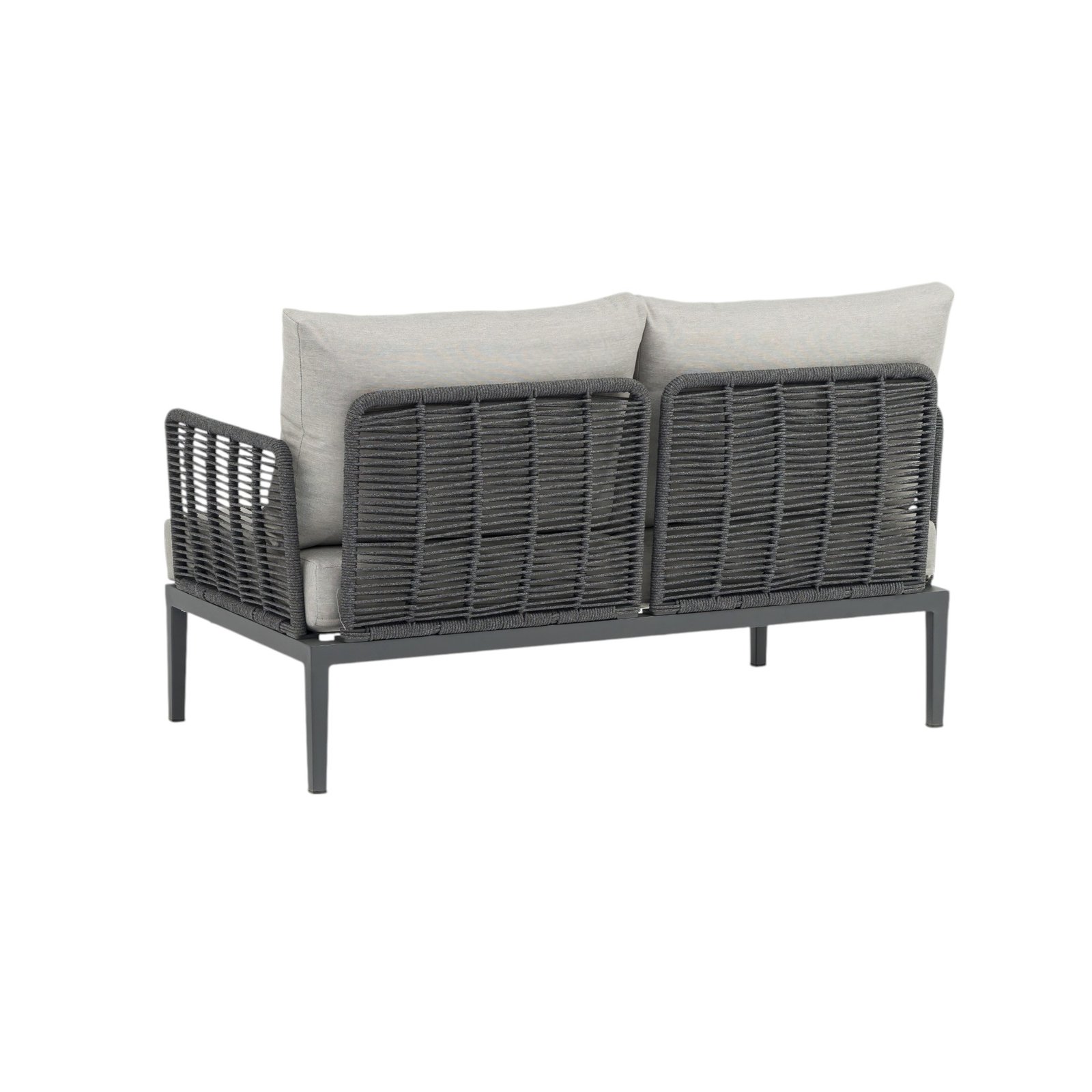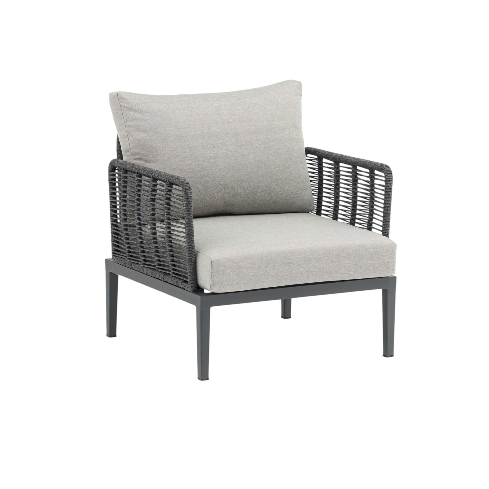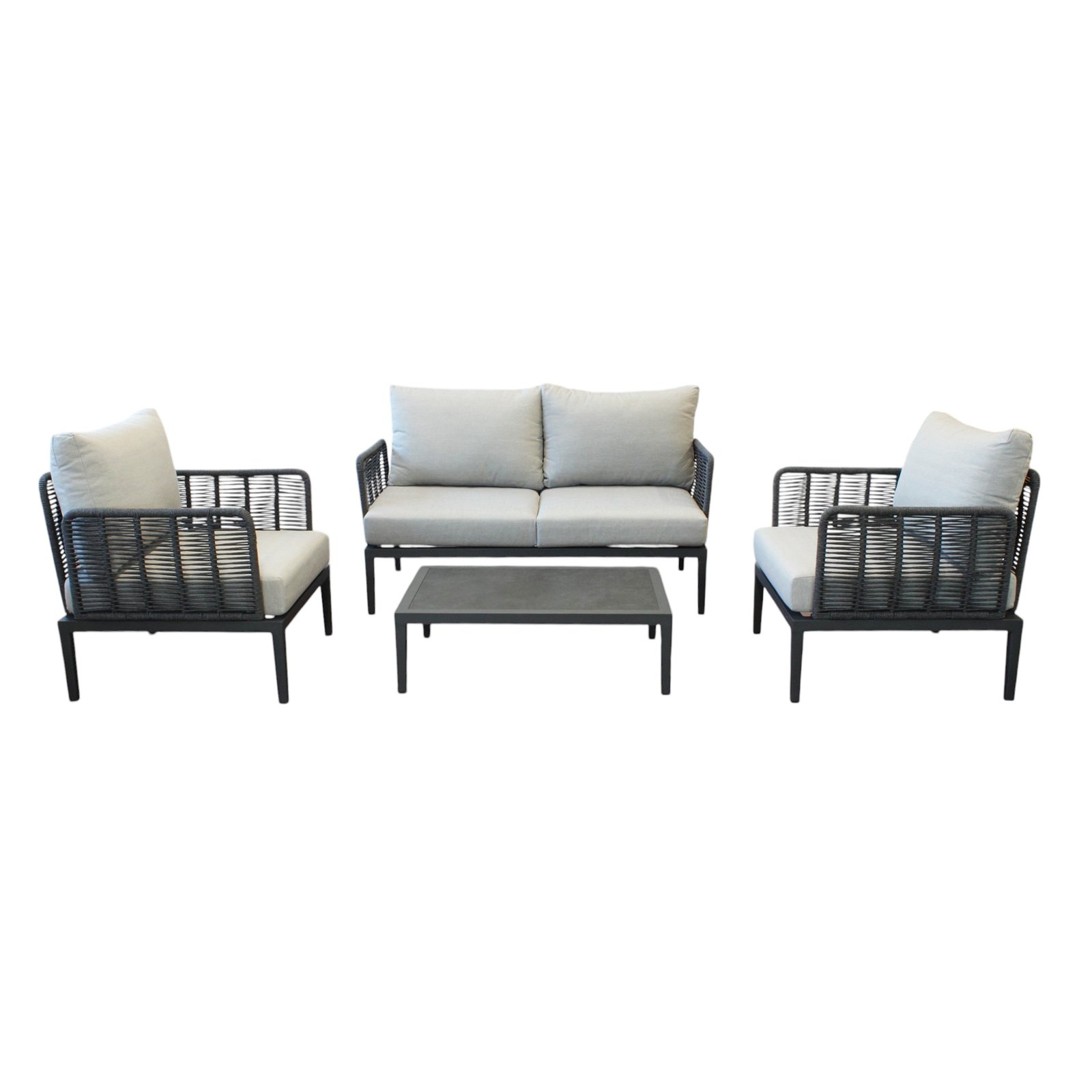 Il salotto da giardino 4 posti QUINLAN è la scelta perfetta per chi desidera arredare gli spazi outdoor con eleganza moderna e materiali di alta qualità. Questo set fisso, pensato per l’arredo giardino e ideale anche per contesti café, combina una struttura in alluminio verniciato antracite con un raffinato rivestimento in corda sintetica, offrendo un equilibrio perfetto tra robustezza e stile. I cuscini grigi, ampi e confortevoli, completano con sobria raffinatezza la seduta del divano a due posti, delle due poltrone e del tavolino centrale dall’estetica minimalista. Le forme geometriche, le linee pulite e l’armonia tra toni neutri e finiture moderne rendono il salotto QUINLAN un complemento ideale per ambienti esterni contemporanei, donando un’atmosfera accogliente e sofisticata. Pensato per vivere momenti di relax o socialità all’aperto, questo salotto da giardino rappresenta una soluzione funzionale e distintiva per valorizzare terrazze, verande e dehors con uno stile ricercato e senza tempo.