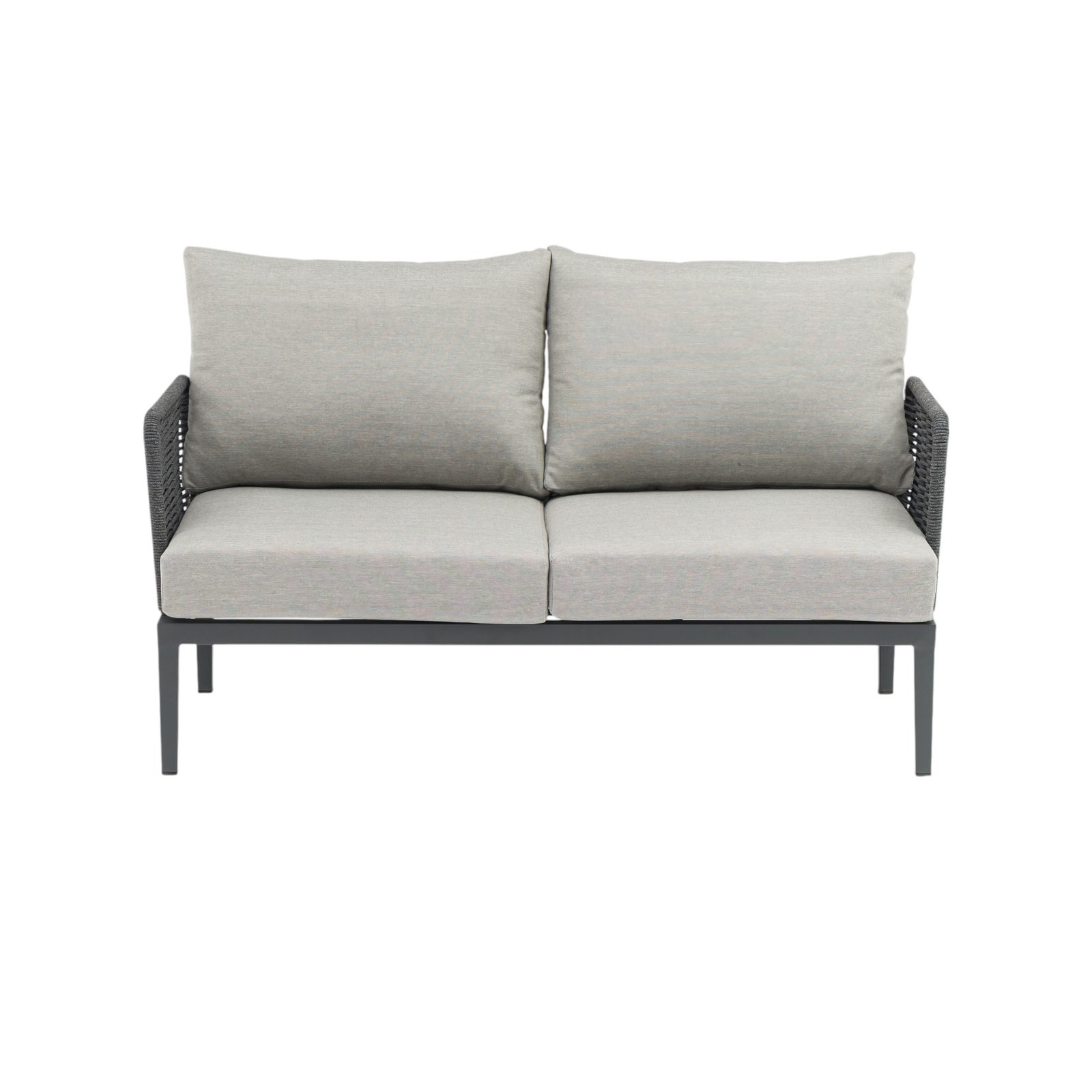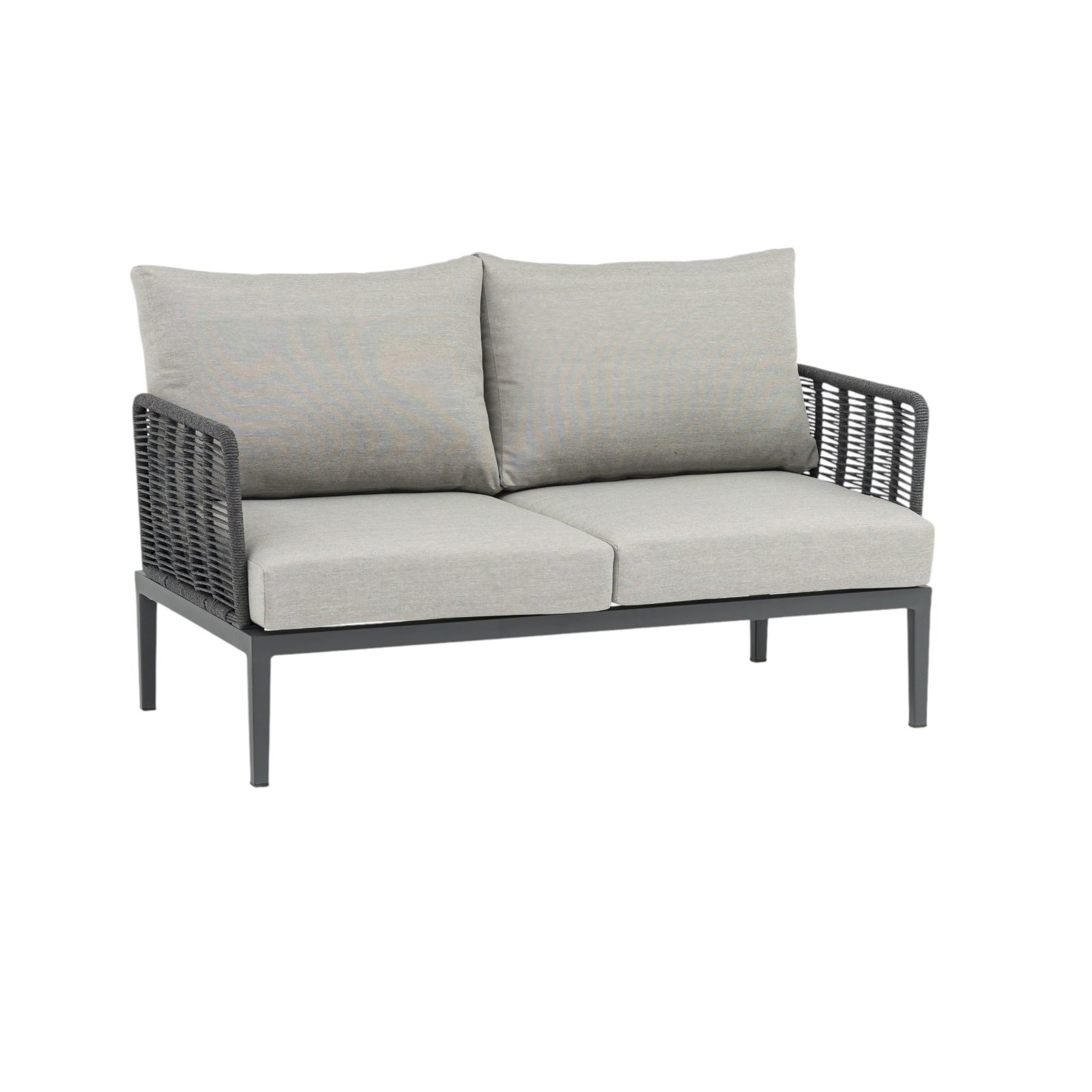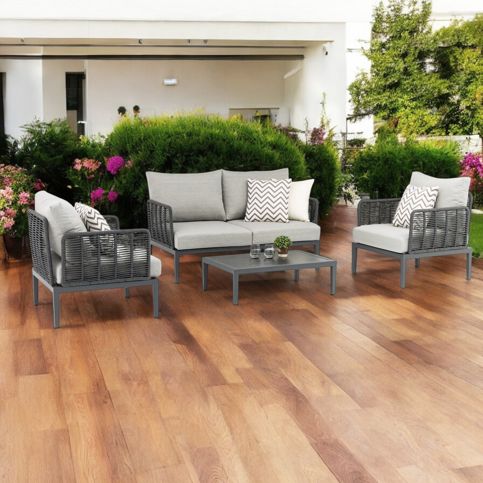 Il salotto da giardino 4 posti QUINLAN è la scelta perfetta per chi desidera arredare gli spazi outdoor con eleganza moderna e materiali di alta qualità. Questo set fisso, pensato per l’arredo giardino e ideale anche per contesti café, combina una struttura in alluminio verniciato antracite con un raffinato rivestimento in corda sintetica, offrendo un equilibrio perfetto tra robustezza e stile. I cuscini grigi, ampi e confortevoli, completano con sobria raffinatezza la seduta del divano a due posti, delle due poltrone e del tavolino centrale dall’estetica minimalista. Le forme geometriche, le linee pulite e l’armonia tra toni neutri e finiture moderne rendono il salotto QUINLAN un complemento ideale per ambienti esterni contemporanei, donando un’atmosfera accogliente e sofisticata. Pensato per vivere momenti di relax o socialità all’aperto, questo salotto da giardino rappresenta una soluzione funzionale e distintiva per valorizzare terrazze, verande e dehors con uno stile ricercato e senza tempo.