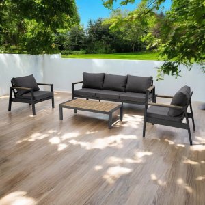 Il Salotto da giardino 5 posti – ASTRID è la scelta ideale per chi desidera arredare spazi esterni con eleganza, funzionalità e comfort. Pensato per ambienti come terrazze, giardini o l’area outdoor di un café, questo salotto da giardino unisce linee minimaliste a materiali di alta qualità. La struttura in alluminio verniciato antracite garantisce resistenza agli agenti atmosferici, mentre i dettagli in effetto legno sul tavolino e sui braccioli aggiungono un tocco caldo e naturale che crea un raffinato contrasto visivo. I cuscini in poliestere da 12 cm, dalle tinte profonde e sofisticate, assicurano un’esperienza di seduta accogliente e rilassante. Lo stile moderno e pulito dell’ASTRID valorizza qualsiasi contesto outdoor contemporaneo, offrendo un equilibrio perfetto tra estetica e praticità. Il tavolino basso completa l’insieme con eleganza, offrendo lo spazio ideale per vivere momenti di convivialità all’aperto. Il Salotto da giardino 5 posti – ASTRID si esprime al meglio in contesti di relax e socialità, dove il design sobrio incontra la massima funzionalità.