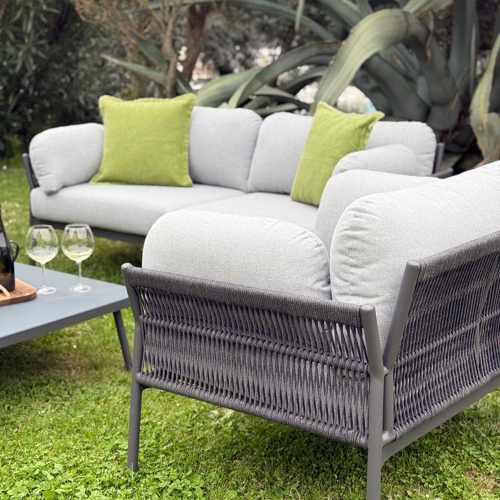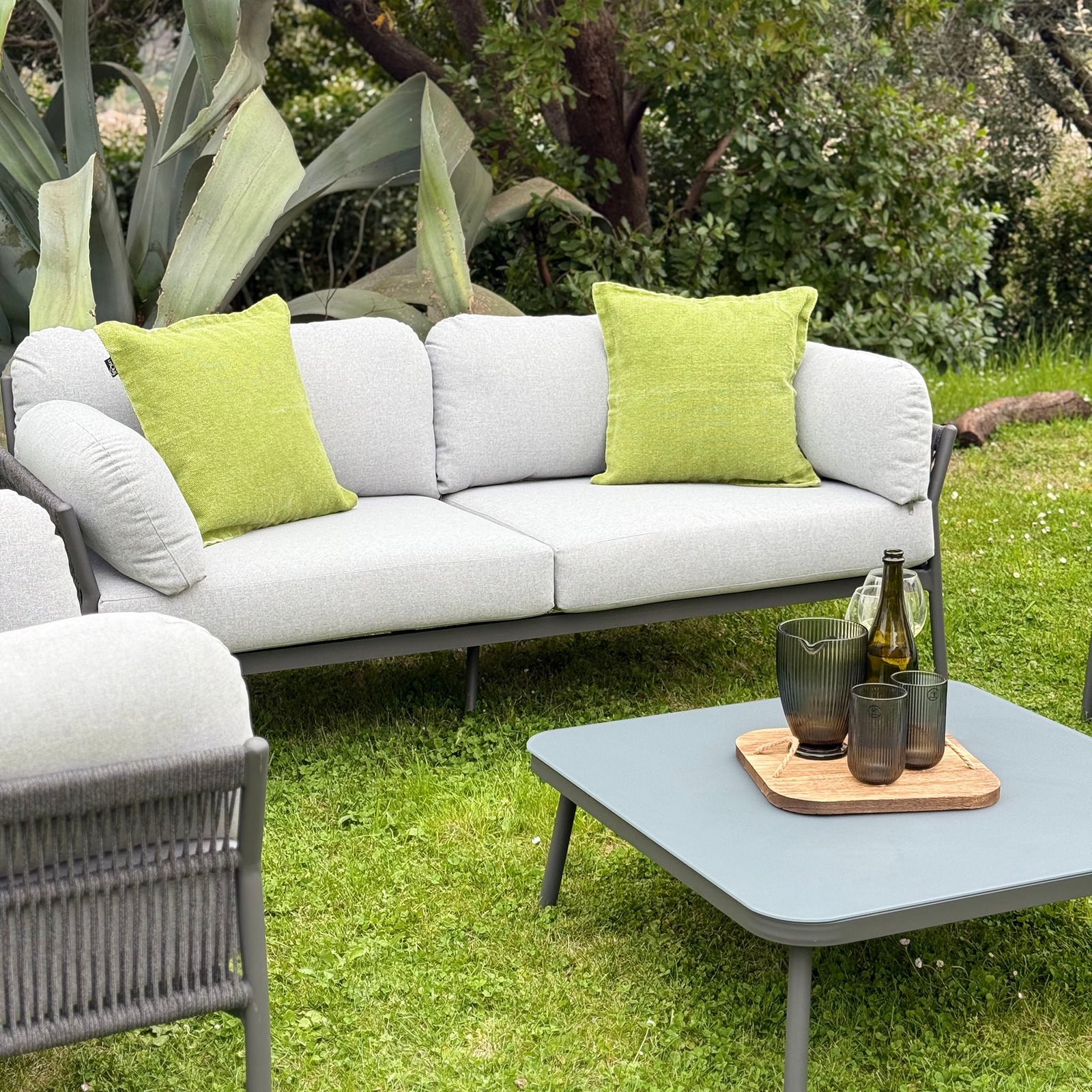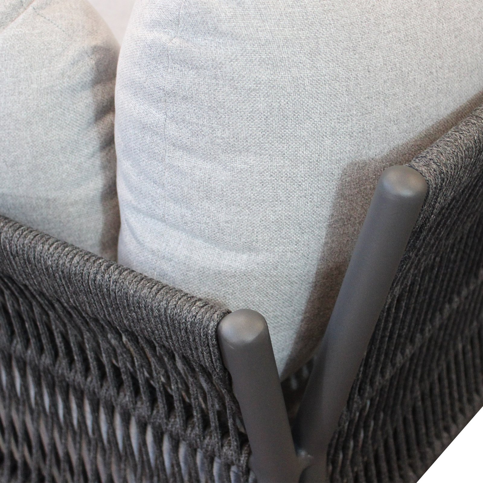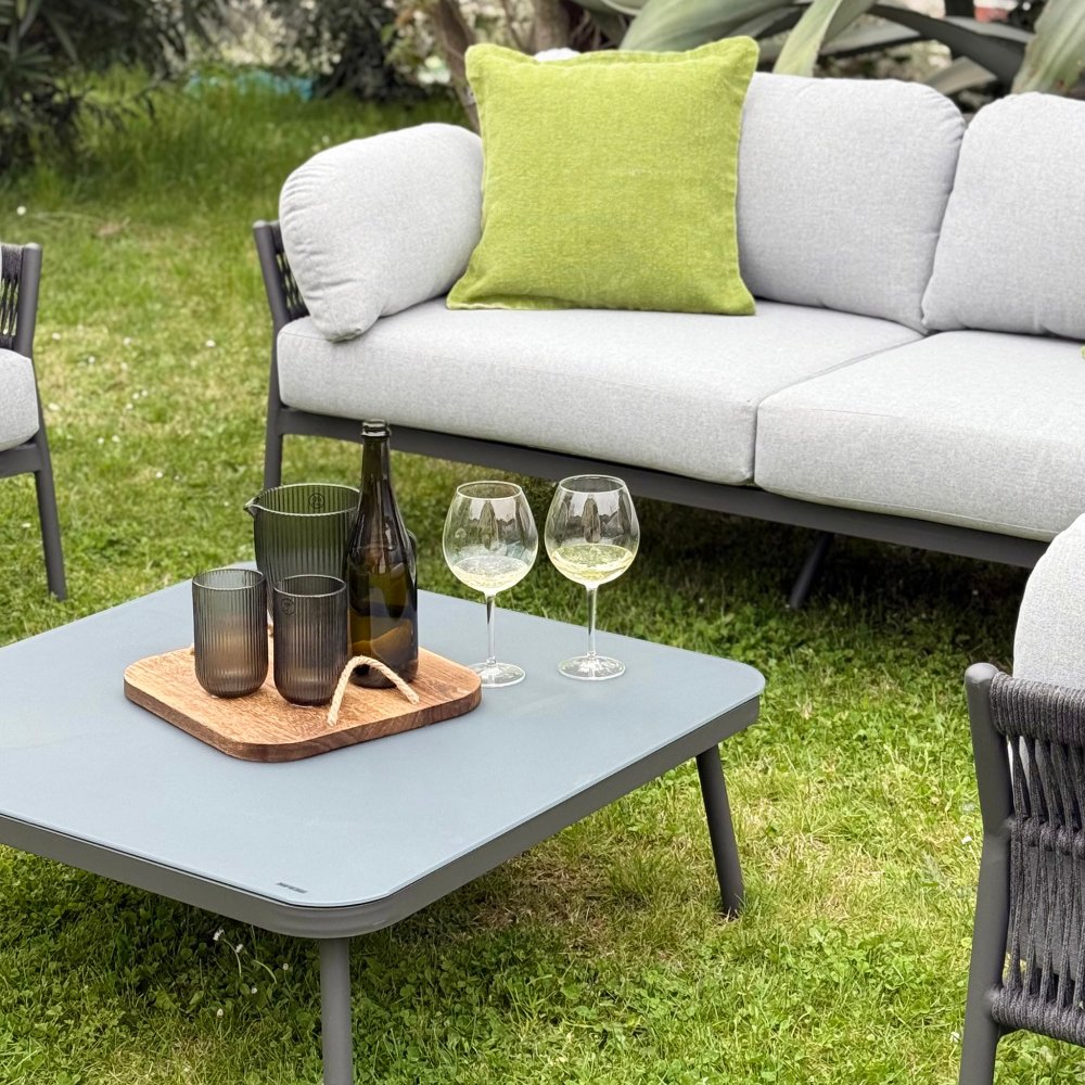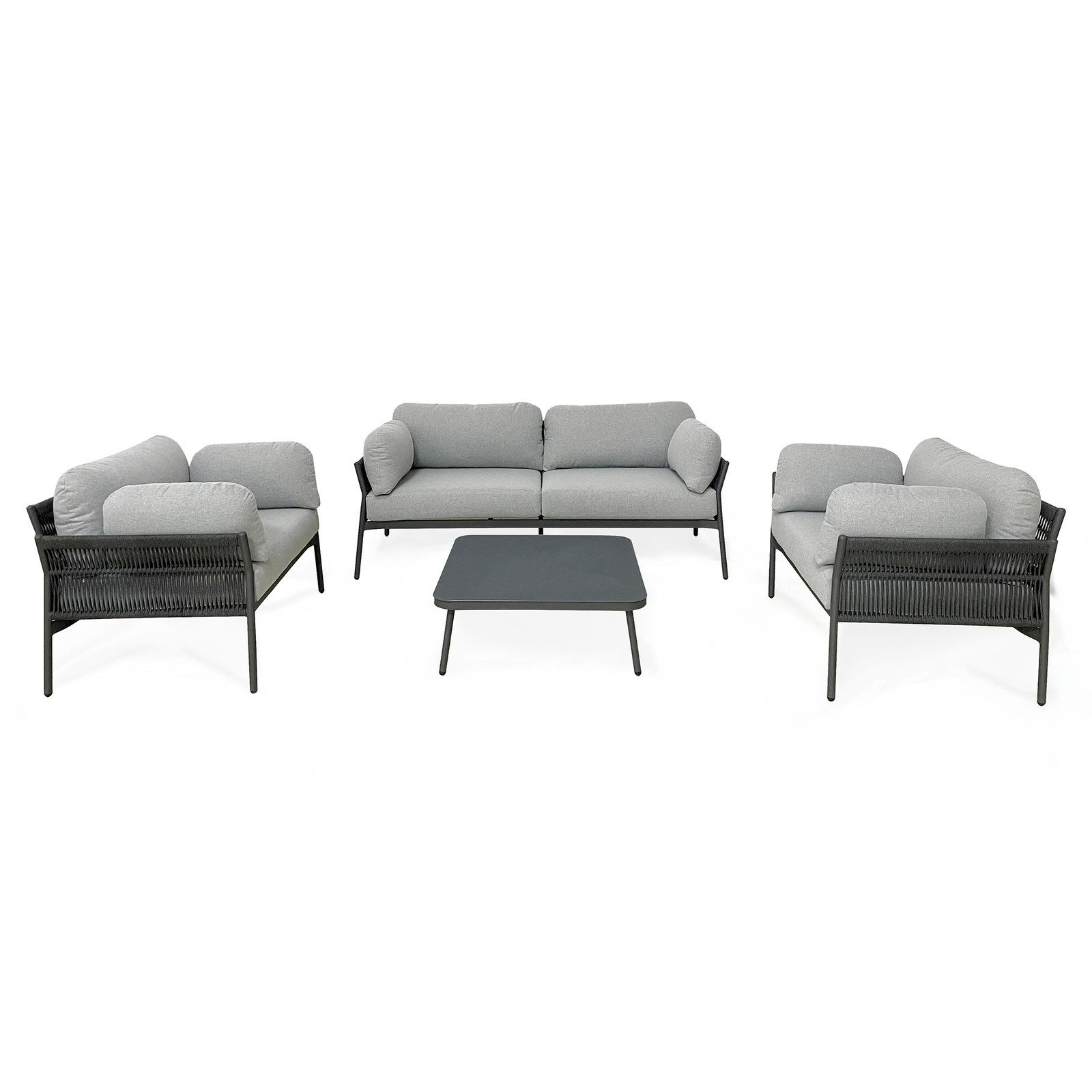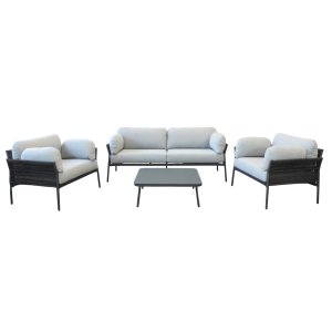 Il Salotto da giardino 5 posti – EVELIN è l’equilibrio perfetto tra eleganza contemporanea e funzionalità outdoor, pensato per valorizzare spazi esterni come terrazze, verande o aree lounge di caffetterie. La struttura in alluminio antracite, leggera e resistente agli agenti atmosferici, è impreziosita da un rivestimento in corda in PVC che avvolge delicatamente i fianchi delle sedute, donando profondità visiva e un tocco artigianale al design moderno. I morbidi cuscini in poliestere grigio, dalle forme generose e accoglienti, enfatizzano il comfort e invitano al relax. Composto da un divano, due poltrone e un tavolino coordinato, il set fisso EVELIN può accogliere fino a cinque persone, offrendo una soluzione ideale per momenti di convivialità all’aria aperta all’insegna dello stile e della praticità. Con linee sobrie e colori neutri che si adattano facilmente a ogni stile di arredo da giardino, questo salotto rappresenta un’ottima scelta per chi desidera creare un angolo elegante e raffinato in ambienti outdoor contemporanei.