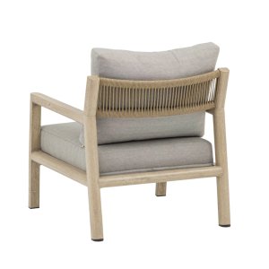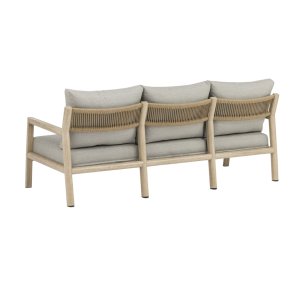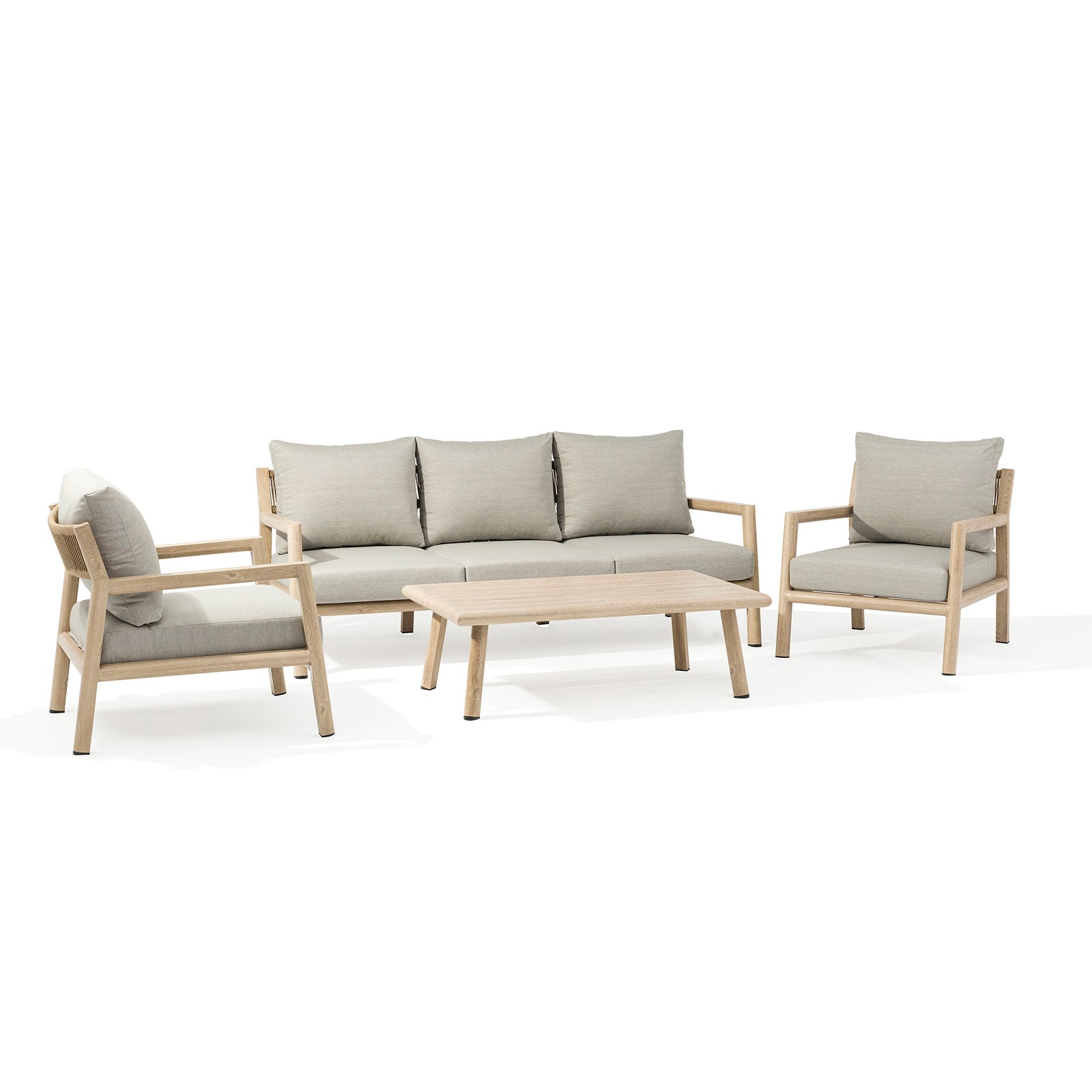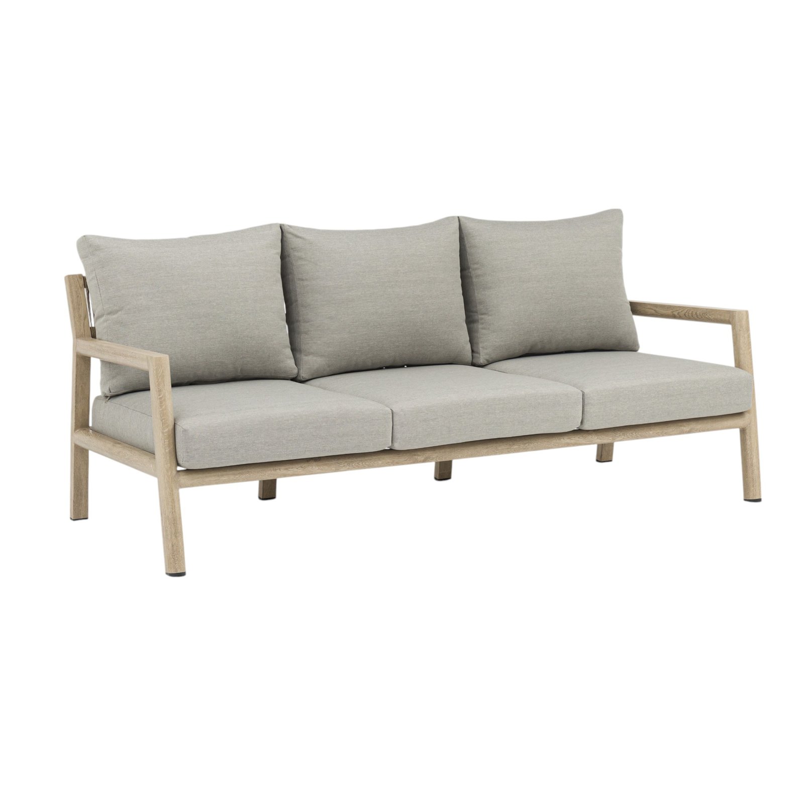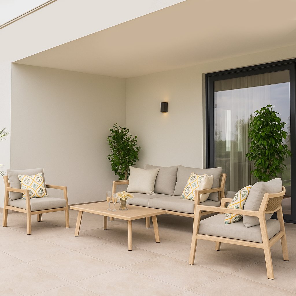 Il Salotto da giardino 5 posti – SABINE rappresenta l’equilibrio perfetto tra estetica moderna e funzionalità, pensato per valorizzare gli spazi outdoor con eleganza e comfort. Composto da un ampio divano a tre posti, due poltrone avvolgenti e un tavolino centrale, questo set da giardino si distingue per la sua struttura in alluminio verniciato con effetto legno naturale che dona calore visivo senza rinunciare alla leggerezza e alla resistenza del metallo. I cuscini in poliestere, rivestiti in un raffinato grigio chiaro, assicurano una seduta confortevole, mentre l’intreccio in corda posta sul retro delle sedute aggiunge un dettaglio materico contemporaneo che esalta lo stile moderno dell’intero arredo. La configurazione fissa e le generose dimensioni rendono il Salotto da giardino SABINE ideale per ambienti come giardini, terrazze e spazi café, offrendo una zona relax perfetta per accogliere fino a cinque persone con stile. Con la sua combinazione di materiali durevoli e design ricercato, questo salotto è la scelta ideale per chi desidera vivere momenti di convivialità all’aperto in un ambiente curato e attuale.