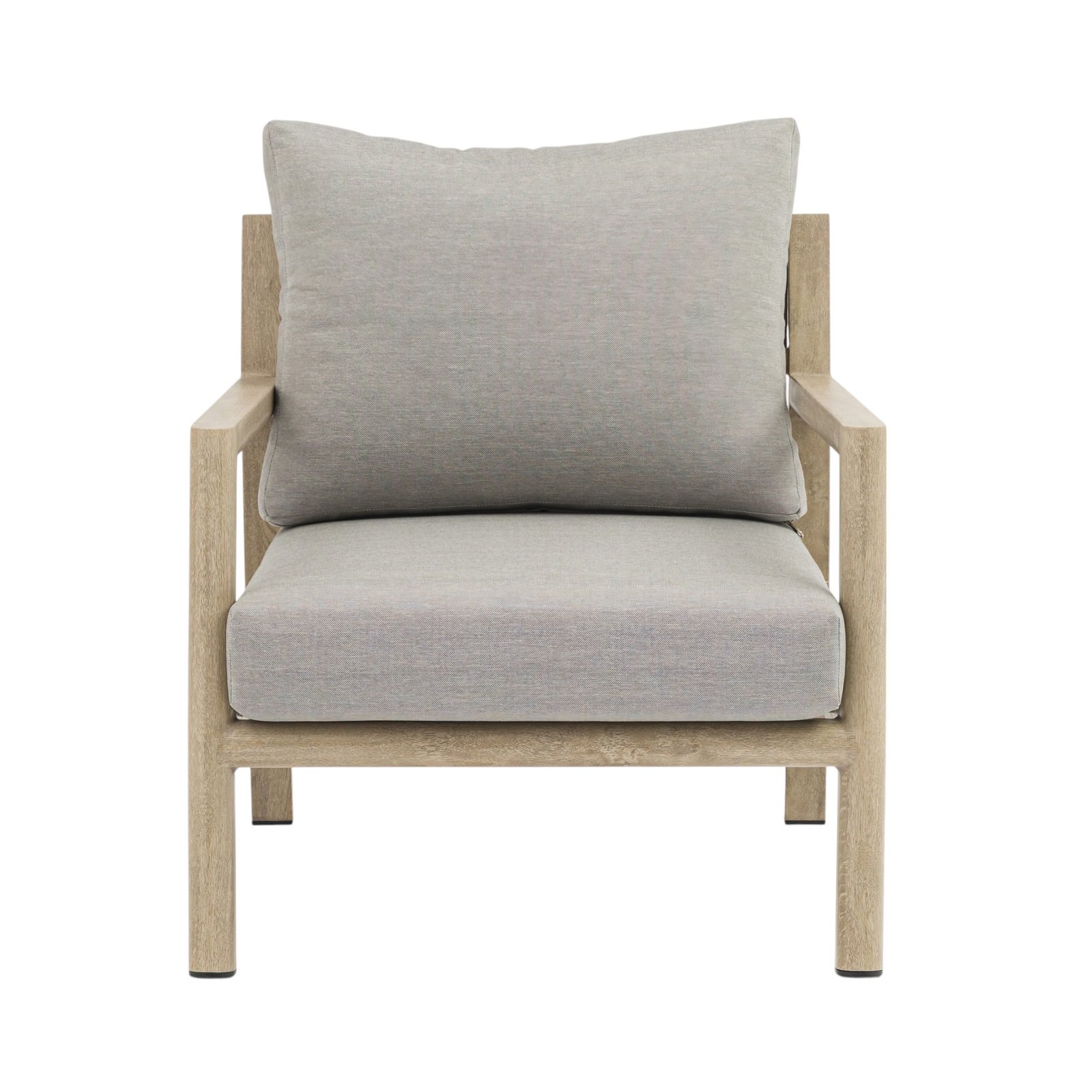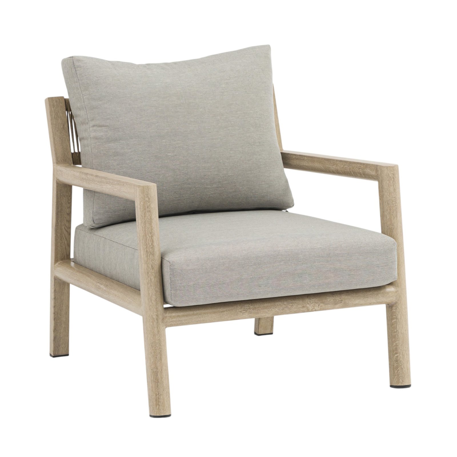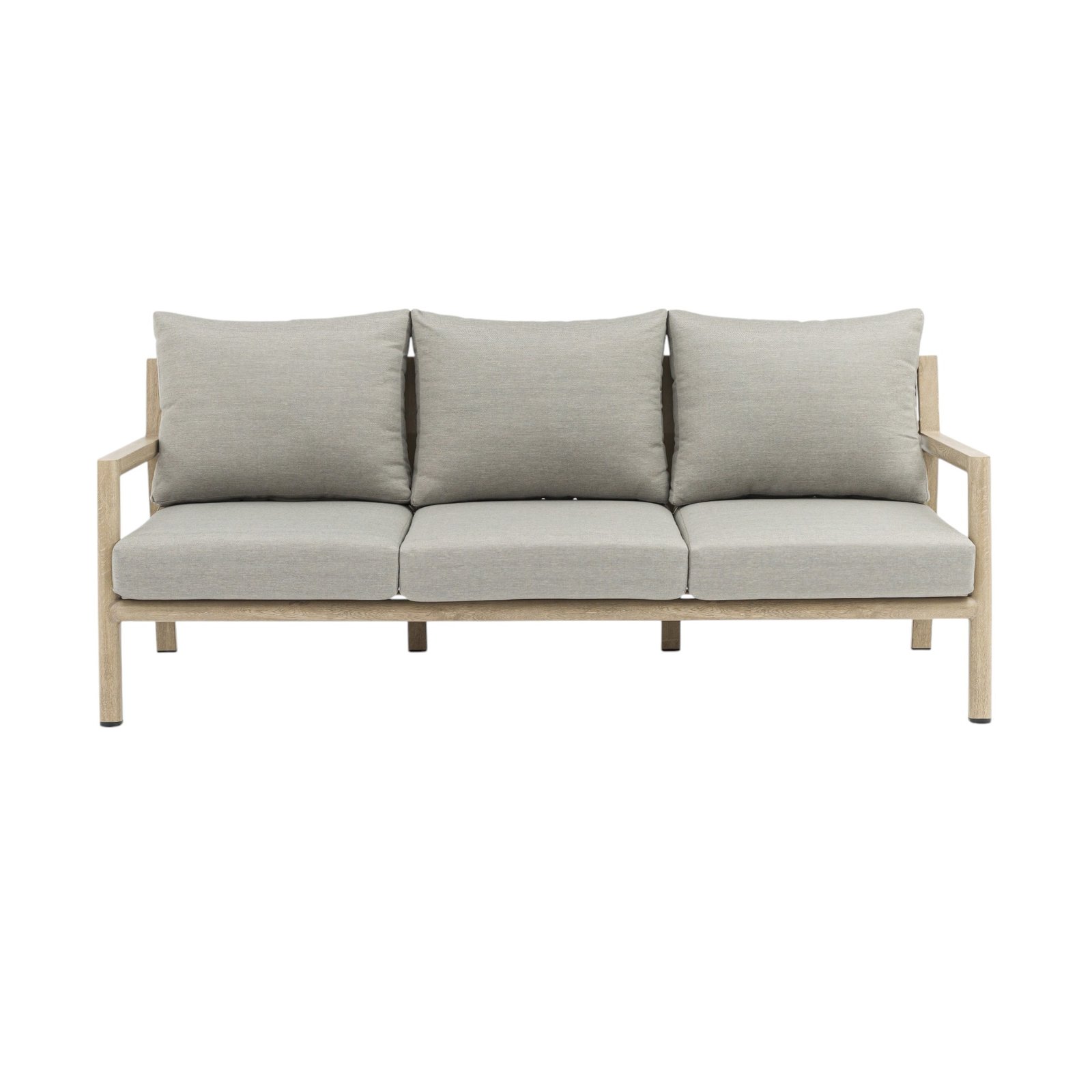 Il Salotto da giardino 5 posti – SABINE rappresenta l’equilibrio perfetto tra estetica moderna e funzionalità, pensato per valorizzare gli spazi outdoor con eleganza e comfort. Composto da un ampio divano a tre posti, due poltrone avvolgenti e un tavolino centrale, questo set da giardino si distingue per la sua struttura in alluminio verniciato con effetto legno naturale che dona calore visivo senza rinunciare alla leggerezza e alla resistenza del metallo. I cuscini in poliestere, rivestiti in un raffinato grigio chiaro, assicurano una seduta confortevole, mentre l’intreccio in corda posta sul retro delle sedute aggiunge un dettaglio materico contemporaneo che esalta lo stile moderno dell’intero arredo. La configurazione fissa e le generose dimensioni rendono il Salotto da giardino SABINE ideale per ambienti come giardini, terrazze e spazi café, offrendo una zona relax perfetta per accogliere fino a cinque persone con stile. Con la sua combinazione di materiali durevoli e design ricercato, questo salotto è la scelta ideale per chi desidera vivere momenti di convivialità all’aperto in un ambiente curato e attuale.