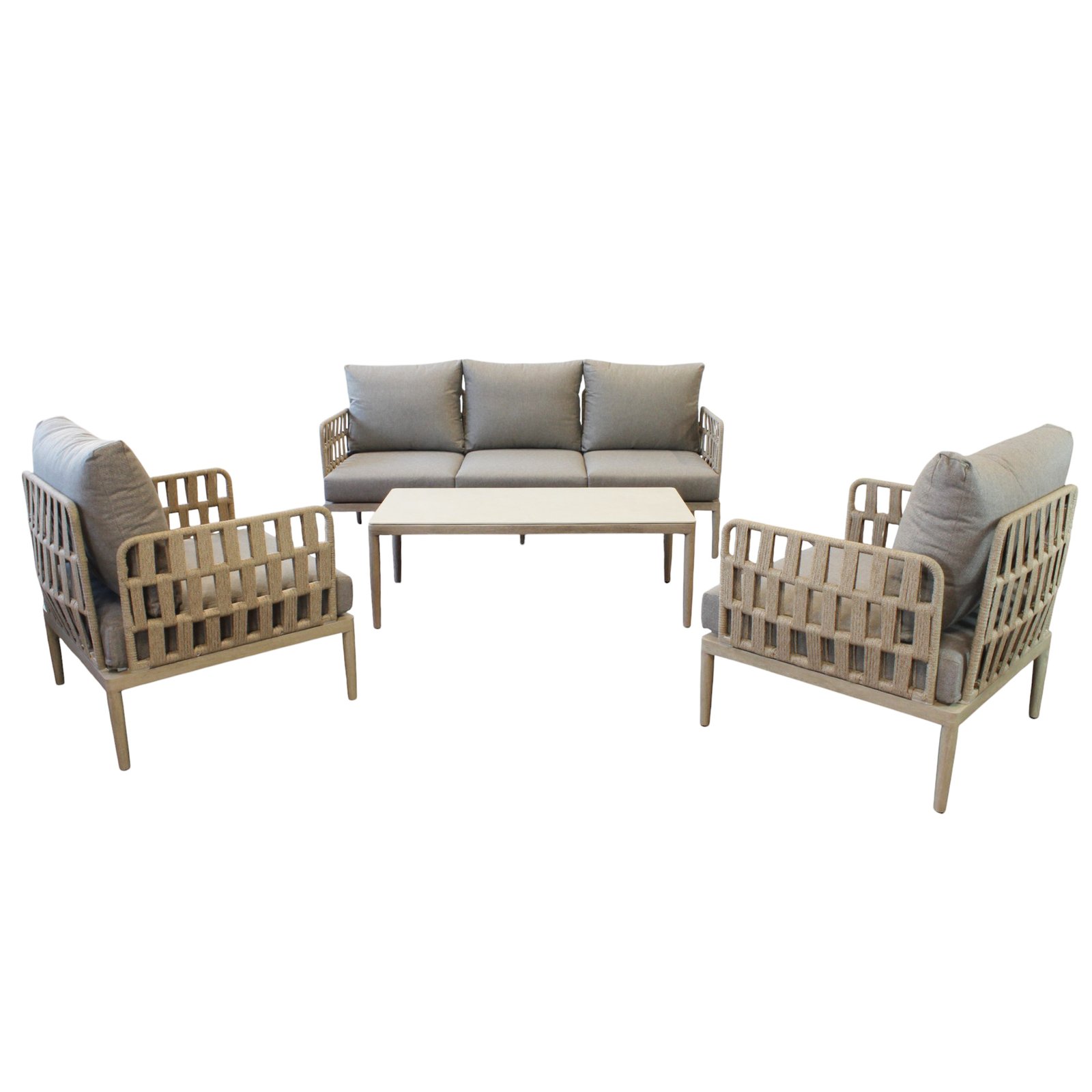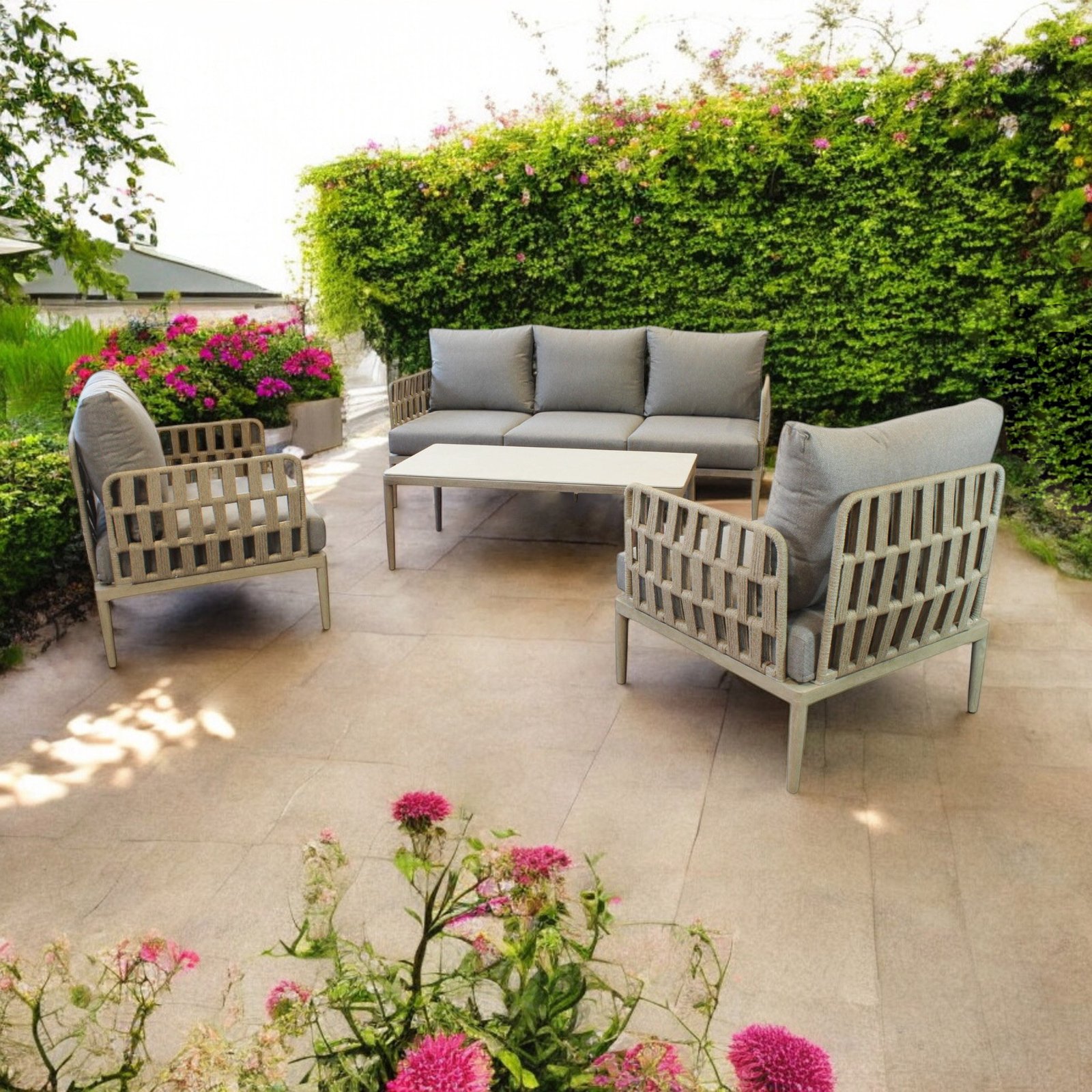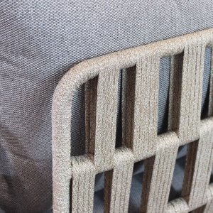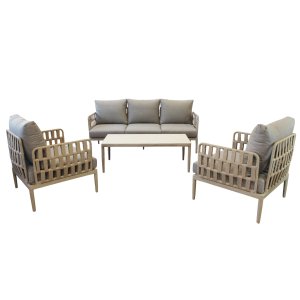 Il Salotto da giardino 5 posti – TEO rappresenta l’equilibrio perfetto tra design moderno e funzionalità per l’arredo outdoor. Caratterizzato da una raffinata struttura in alluminio verniciato antracite, abbinata a un elegante rivestimento in corda sintetica PVC, questo set fisso si distingue grazie al sofisticato contrasto tra i toni scuri della struttura e i cuscini grigio chiaro dal volume generoso. Composto da un ampio divano tre posti, due poltrone singole e un tavolino rettangolare basso, il salotto TEO unisce materiali durevoli e resistenti agli agenti atmosferici con un’estetica geometrica essenziale e accattivante. Ideale per valorizzare spazi all’aperto come terrazze, dehors di café o giardini privati, dona immediatamente un’atmosfera accogliente e contemporanea. Ogni elemento è progettato per offrire il massimo del comfort senza rinunciare all’eleganza, con un linguaggio stilistico pulito che si inserisce con naturalezza in ogni ambiente. Il salotto da giardino TEO si esprime al meglio in contesti sociali rilassati, trasformando ogni momento all’aperto in un’esperienza di benessere e stile.