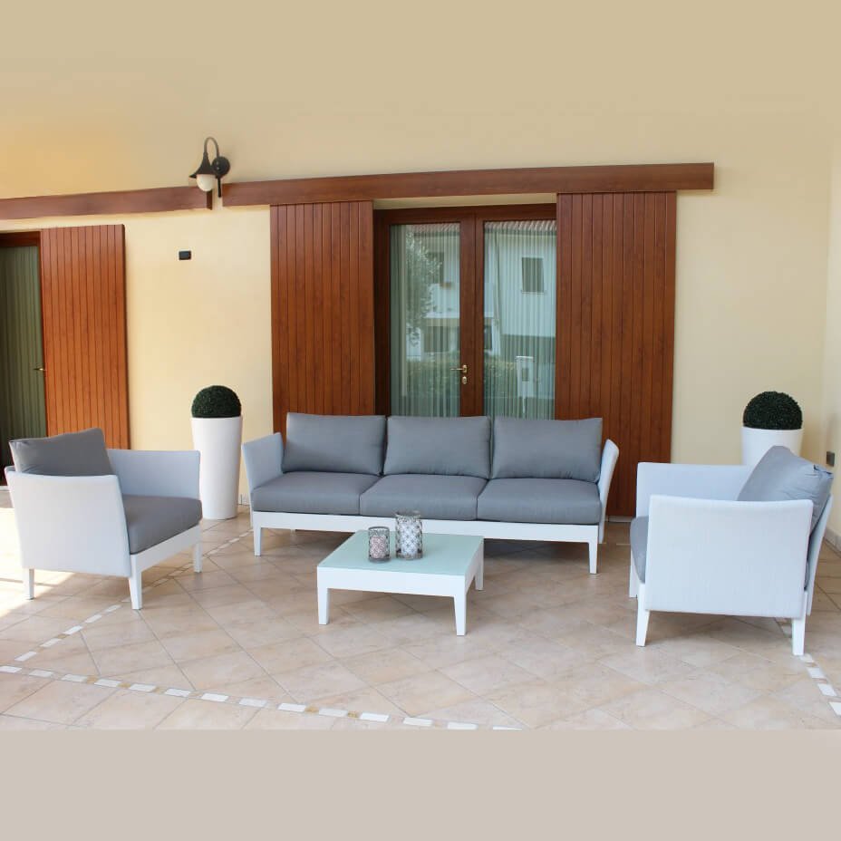 Il Salotto da Giardino con cuscini 5 posti in Alluminio Textilene – LOVEL è la soluzione ideale per valorizzare gli spazi esterni con eleganza contemporanea e funzionalità. Progettato per offrire massimo comfort e durata, questo salotto si distingue per la sua struttura solida in alluminio verniciato a polvere bianca, resistente agli agenti atmosferici e facile da mantenere. I braccioli e gli schienali sono realizzati in textilene grigio melange, materiale tecnico traspirante e di rapida asciugatura, mentre i morbidi cuscini in poliestere grigio chiaro aggiungono una nota di raffinatezza e assicurano un comfort di seduta superiore. Le linee essenziali e l’equilibrio cromatico tra il bianco luminoso e le tonalità grigie rendono questo arredo perfetto per giardini moderni, terrazze e verande arredate con gusto minimalista. Il design componibile consente di adattare con flessibilità le sedute in base alle esigenze, offrendo spazio accogliente per 5 persone. Il Salotto da Giardino LOVEL esprime tutto il suo valore in ambienti outdoor dove stile e relax convivono armoniosamente, regalando piacevoli momenti all’aria aperta, tra comfort e design sofisticato.