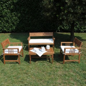 Il Salotto da Giardino in Acacia – AURELIO è la scelta ideale per chi desidera arredare con eleganza e funzionalità i propri spazi outdoor. Realizzato in legno di acacia massiccio, questo set da giardino si distingue per la sua robustezza naturale e il fascino autentico del marrone caldo, che richiama le tonalità della terra e si armonizza perfettamente con l’ambiente esterno. Composto da un tavolino, due poltrone e un divanetto a due posti, è pensato per accogliere fino a 4 persone, offrendo momenti di relax in compagnia. I cuscini bianchi, con uno spessore di 4 cm, donano comfort e freschezza, creando un piacevole contrasto cromatico con la struttura in legno, dallo stile lineare e senza tempo. Perfetto per giardini, verande o terrazze, il set AURELIO unisce design essenziale e materiali di alta qualità, per conferire all’arredo da esterno un tocco naturale e raffinato. Ideale per colazioni all’aperto, letture pomeridiane o aperitivi al tramonto, questo salotto da giardino valorizza ogni momento all’aria aperta, combinando estetica e praticità in una soluzione che rispecchia uno stile di vita accogliente e rilassato.