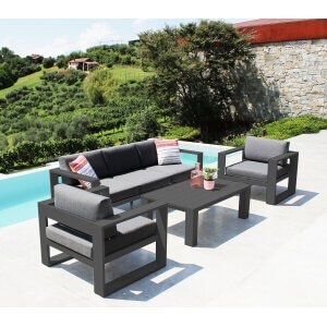 Il design sofisticato si distingue per le linee moderne e proporzioni generose, che assicurano ampia comodità per 5 persone. Il set include un tavolino coordinato, perfetto per appoggiare drink, libri e accessori, completando un angolo outdoor dallo stile inconfondibile.