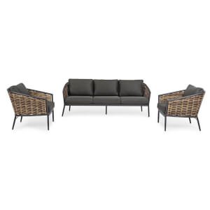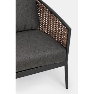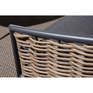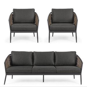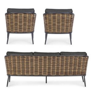 Il Salotto 3 Posti Alluminio Antracite Moderno da Esterno – MARIBELA rappresenta una soluzione d’arredo elegante e contemporanea per trasformare ogni spazio all’aperto in un’oasi di comfort. Composto da un divano a tre posti e due poltrone coordinate, questo salotto da giardino si distingue per la struttura in alluminio verniciato a polvere color antracite, solida e leggera, pensata per resistere nel tempo anche alle intemperie. L’intreccio in fibra sintetica tonda da 9 mm richiama con gusto artigianale l’estetica del rattan naturale, aggiungendo calore e texture allo stile moderno del set. I cuscini imbottiti, sfoderabili e rivestiti in tessuto Olefin idrorepellente, garantiscono un’elevata comodità e una manutenzione semplice, senza rinunciare all’eleganza. Il design essenziale ma raffinato del salotto MARIBELA lo rende perfetto per arredare con stile giardini, terrazze e bordi piscina, offrendo un ambiente accogliente e funzionale dove vivere appieno il relax all’aria aperta.