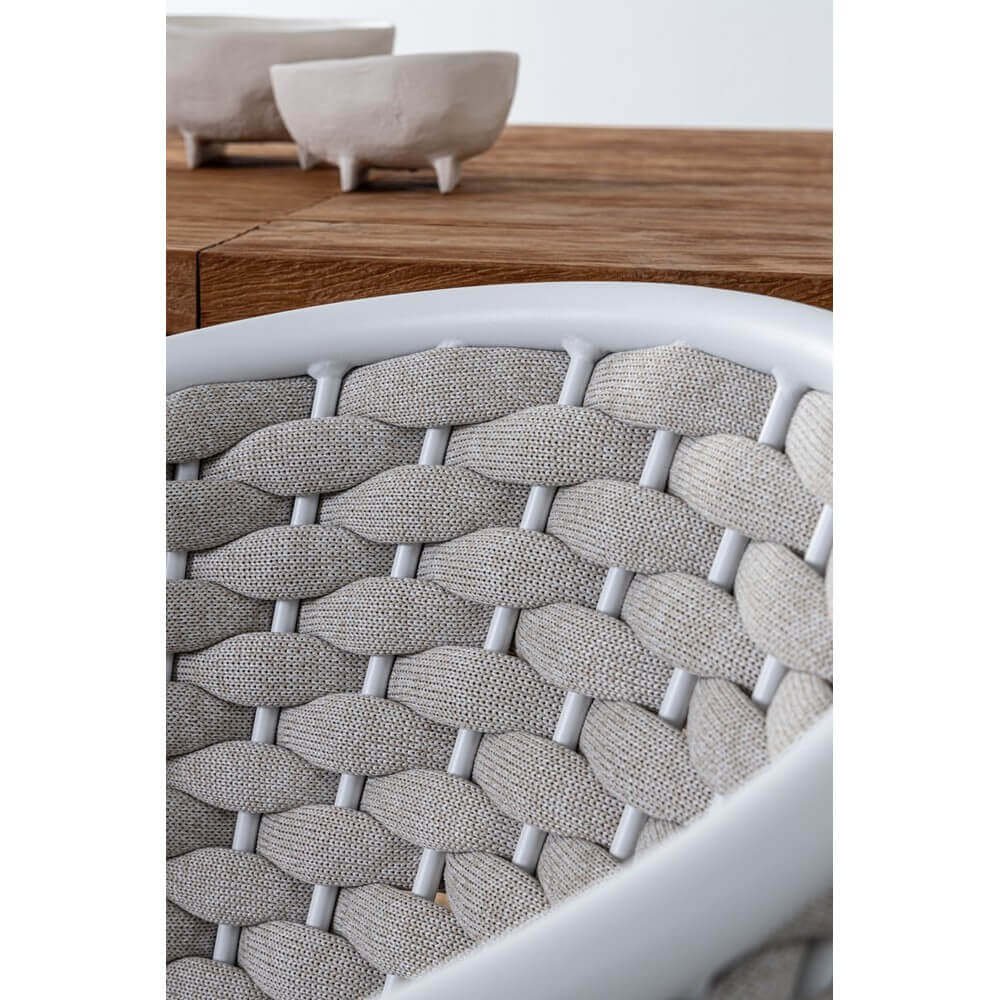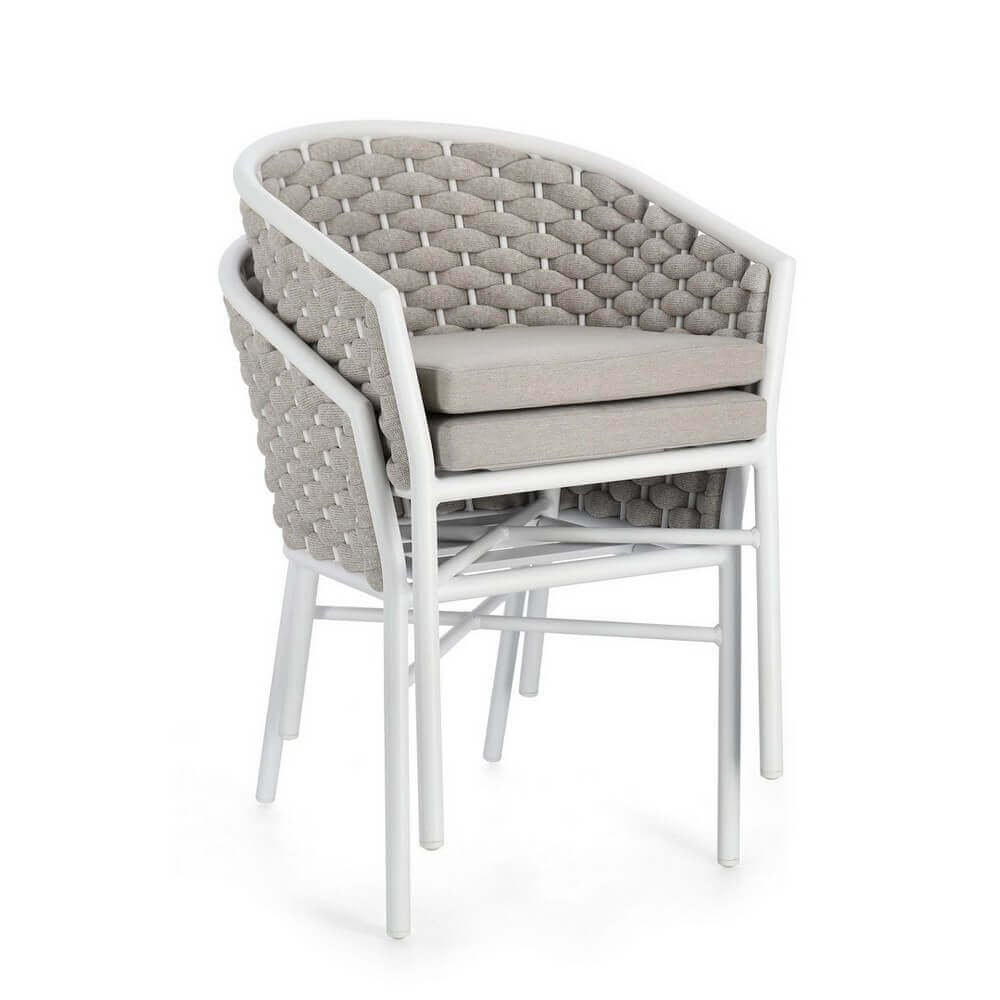 Elegante fusione tra design contemporaneo e funzionalità outdoor, il Set 4 Sedie con Braccioli Alluminio Bianco da Esterno – NIREYA è la scelta ideale per valorizzare terrazze, giardini e verande con uno stile ricercato e sofisticato. La solida struttura in alluminio verniciato a polvere garantisce leggerezza, durata e resistenza agli agenti atmosferici, mentre lo schienale avvolgente in intreccio di corda imbottita crea un effetto visivo accattivante e una seduta comoda e accogliente. I cuscini sfoderabili, realizzati in tessuto idrorepellente 100% poliestere, assicurano praticità e comfort, rendendo queste sedie perfette per lunghi momenti di relax all’aperto. Il colore bianco, delicato ed essenziale, si abbina con naturalezza a diversi stili di arredo da giardino, dal moderno al mediterraneo, illuminando con sobrietà qualsiasi ambiente esterno. Inoltre, la struttura impilabile rende il set NIREYA estremamente pratico da riporre al termine della stagione o in caso di necessità. Ideali per arredare con gusto e funzionalità gli spazi outdoor, queste sedie esprimono al meglio il loro valore nel contesto di una cena all’aperto, un aperitivo tra amici o semplicemente per godersi la tranquillità di un pomeriggio estivo.
