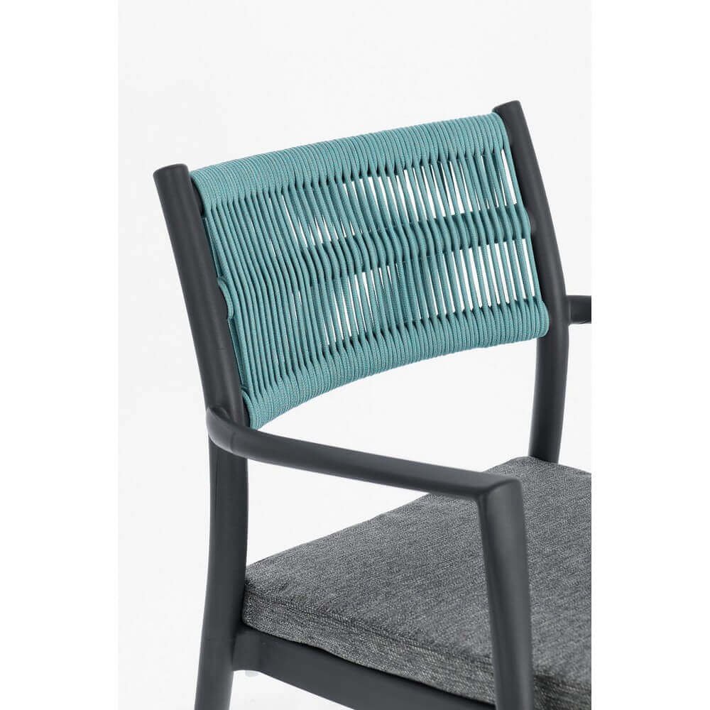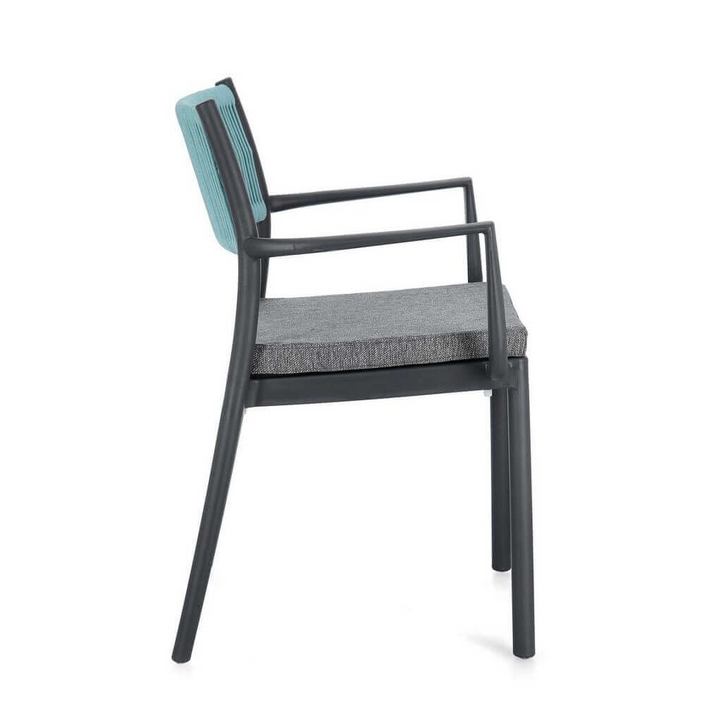 Polipropilene (pp), resistente ai raggi uv. schienale con intreccio in corda di poliestere. cuscino seduta sfoderabile con tessuto idrorepellente poliestere. impilabile.